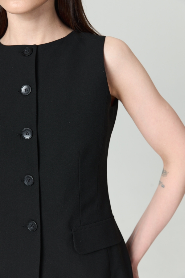 Жилет полуприлегающего силуэта из костюмной поливискозы. По переду функциональная застежка на петли и пуговицы, имитация карманов с клапанами. По спинке рельефы, хлястик.