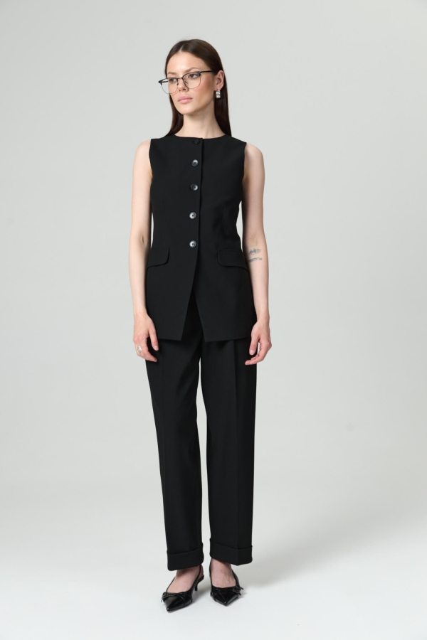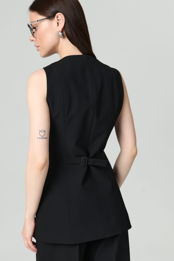 Жилет полуприлегающего силуэта из костюмной поливискозы. По переду функциональная застежка на петли и пуговицы, имитация карманов с клапанами. По спинке рельефы, хлястик.