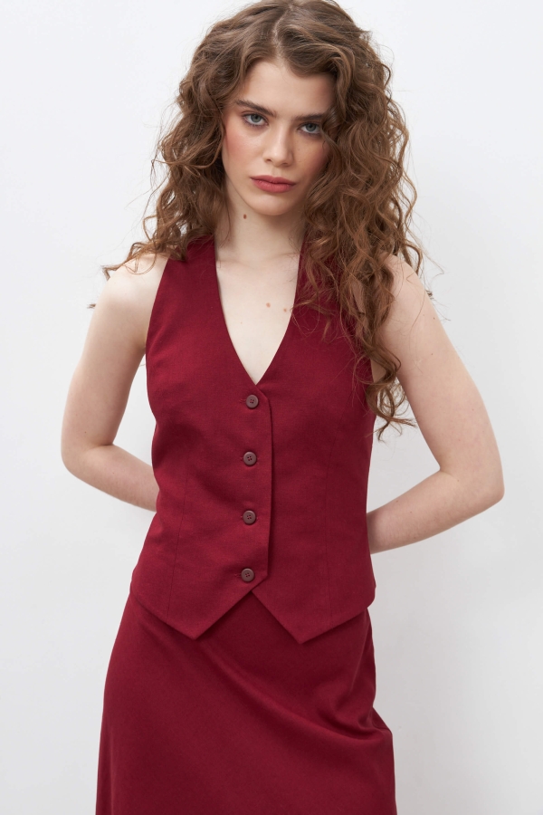 Жилет из льна с открытой спинкой. Модель прилегающего силуэта с открытой спиной.По переду застежка на петли и пуговицы. По спинке рельефы и хлястик-регулятор с металлической пряжкой. На подкладе.