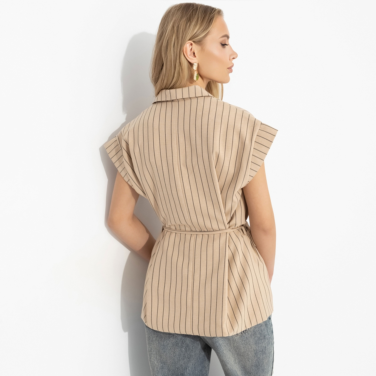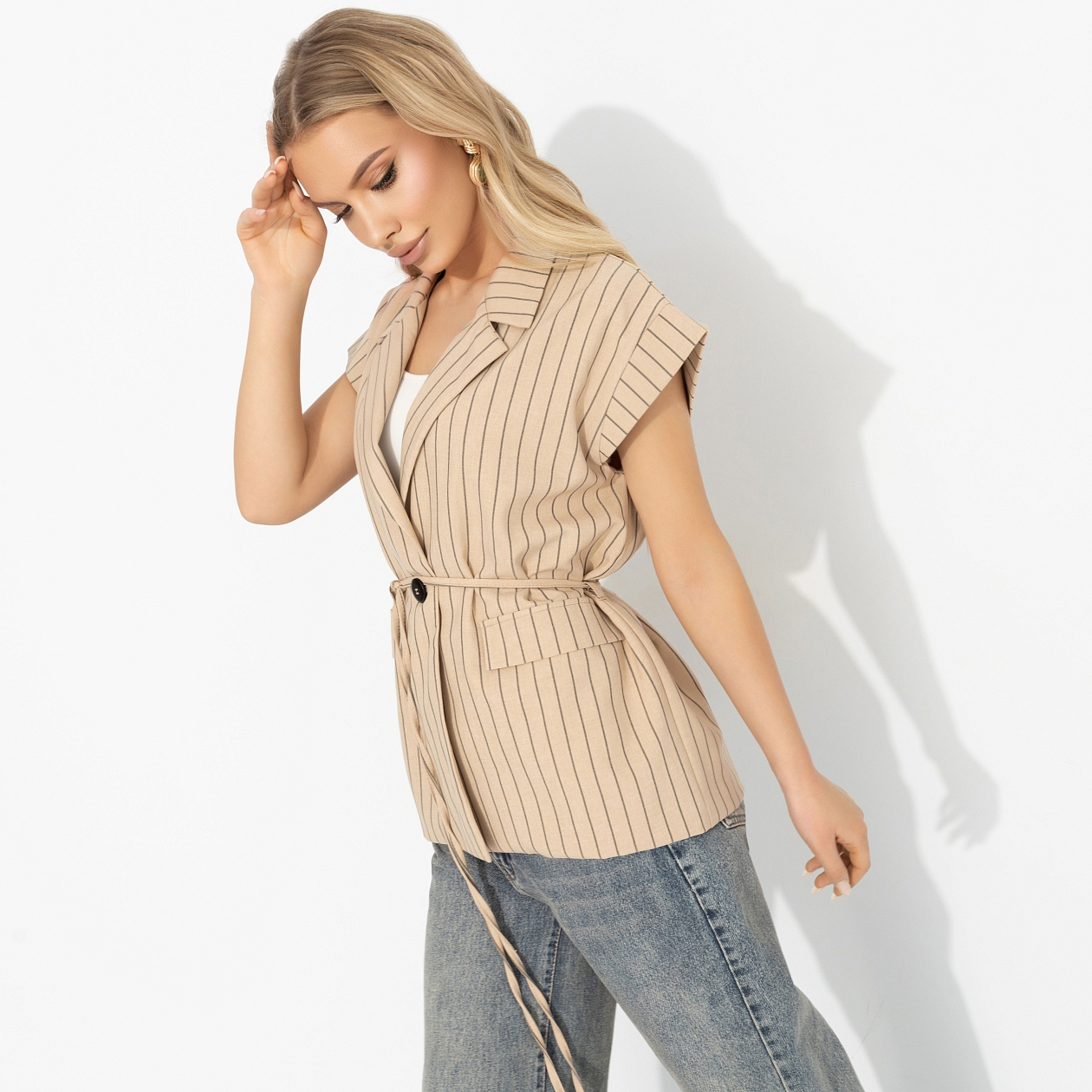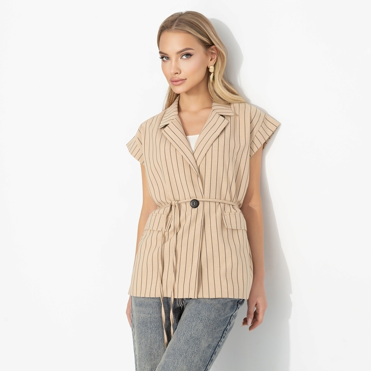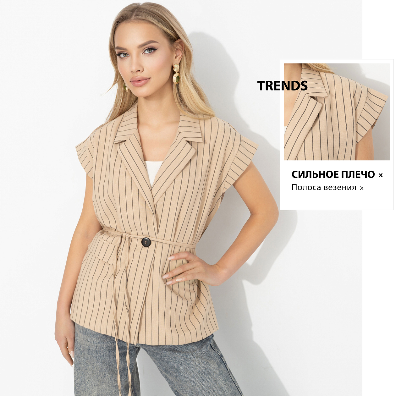 Выходи на «охоту»! Не всерьёз, а за настроением: свет, взгляды, случайные детали. Жилет ЧАРУТТИ организует тебе сафари-фотоохоту в городских джунглях: оттенок латте, полоска как карта маршрута и вайб отпуска в саванне, где ты – главный наблюдатель. Лён в составе даёт воздух и ощущение свободы. Полоска вытягивает фигуру и делает образ чище. Работает как акцент поверх базы – с льняными брюками или даже поверх платья.