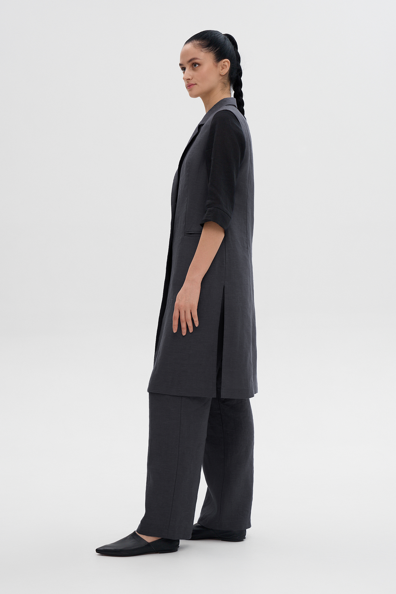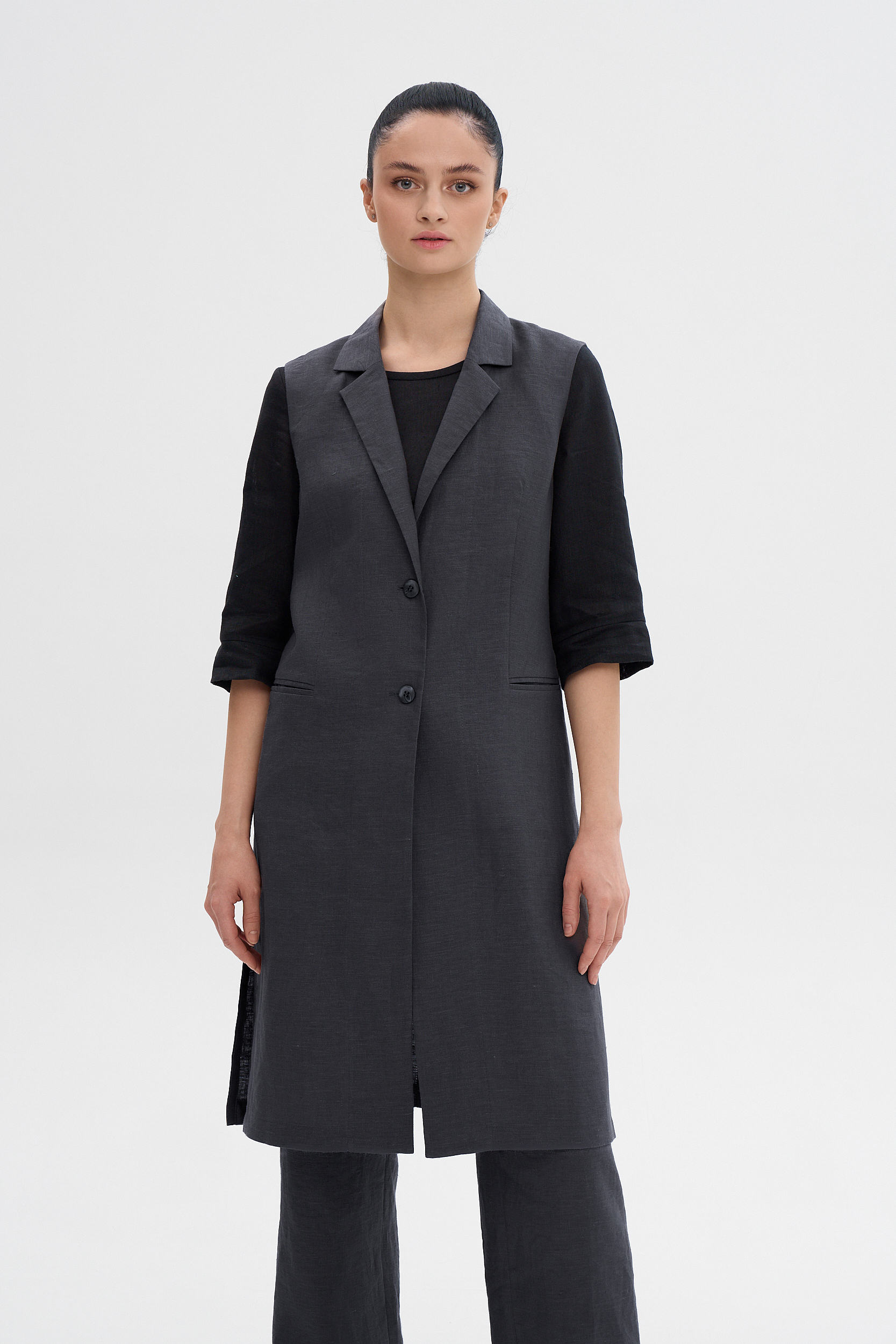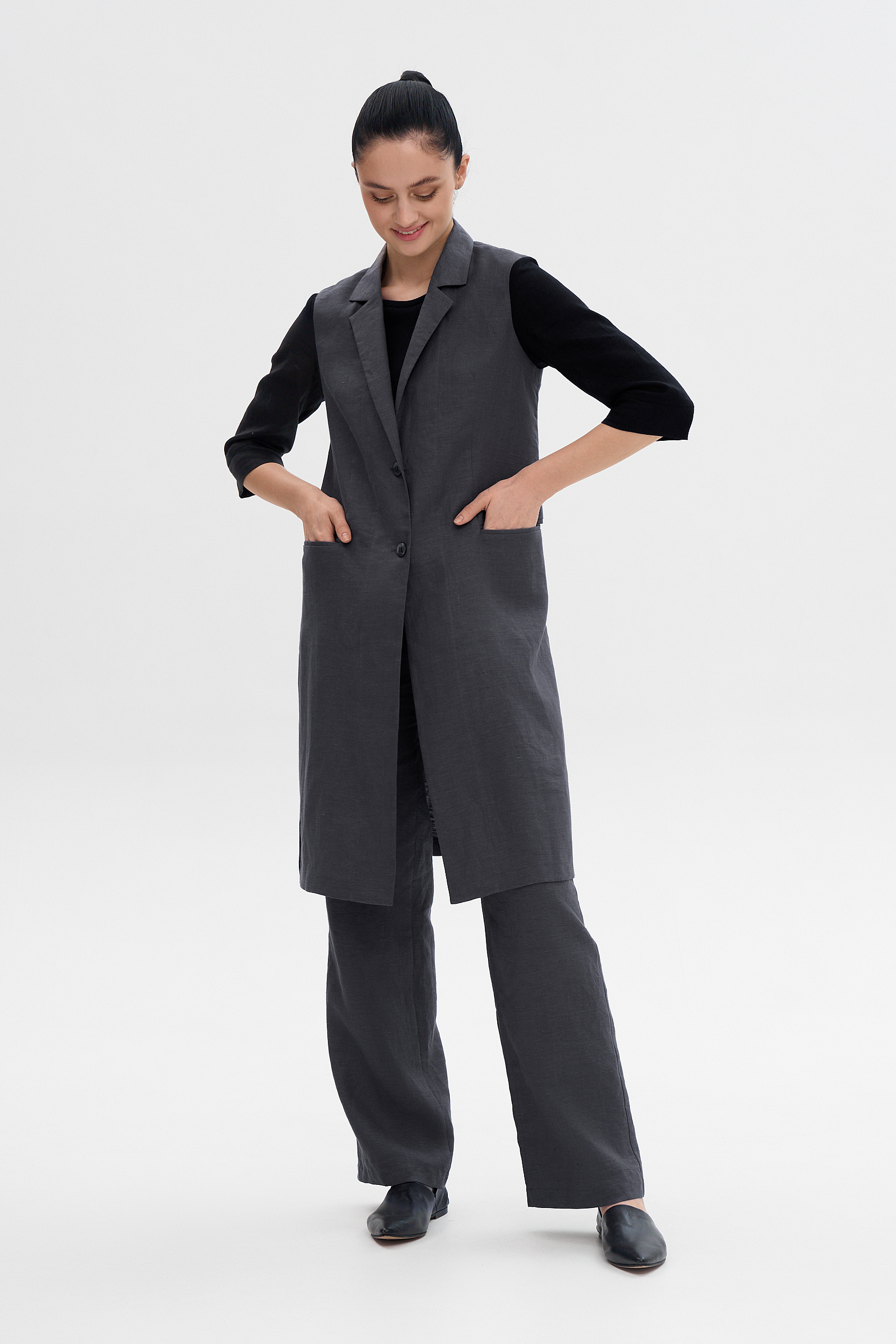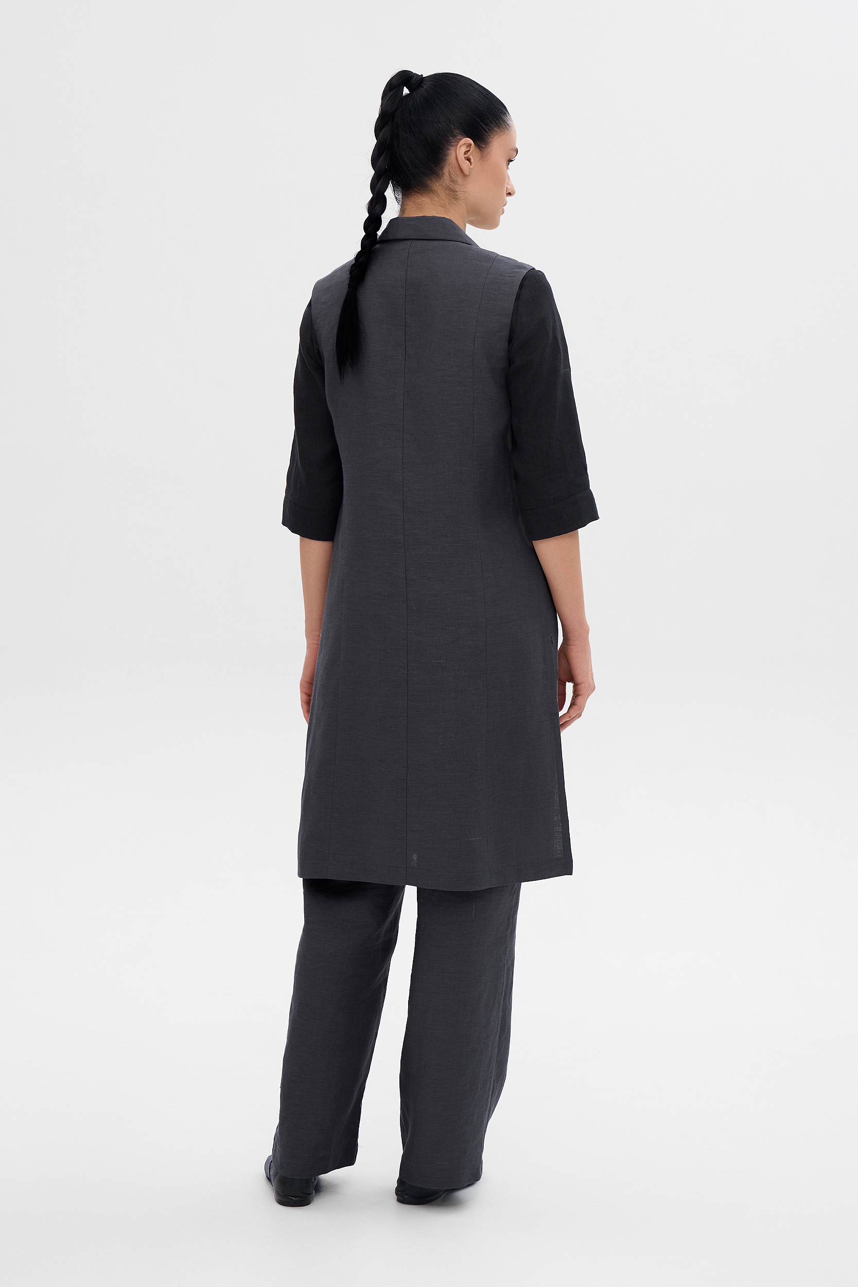 Жилет длинный прямого силуэта с прорезным карманом в рамку, рельефами по спинке и разрезами по бокам. Застёжка центральная на 2 пуговицы. Воротник «английский» пиджачного типа.