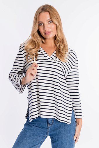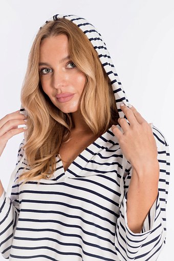 Футболка в полоску выполнена из кулирки с лайкрой. С капюшоном со шнуром и рукавом длиной 3/4. Горловина с V-образым вырезом с планками, переходящими в капюшон. Внизу изделия, в боковых швах декоративные разрезы.