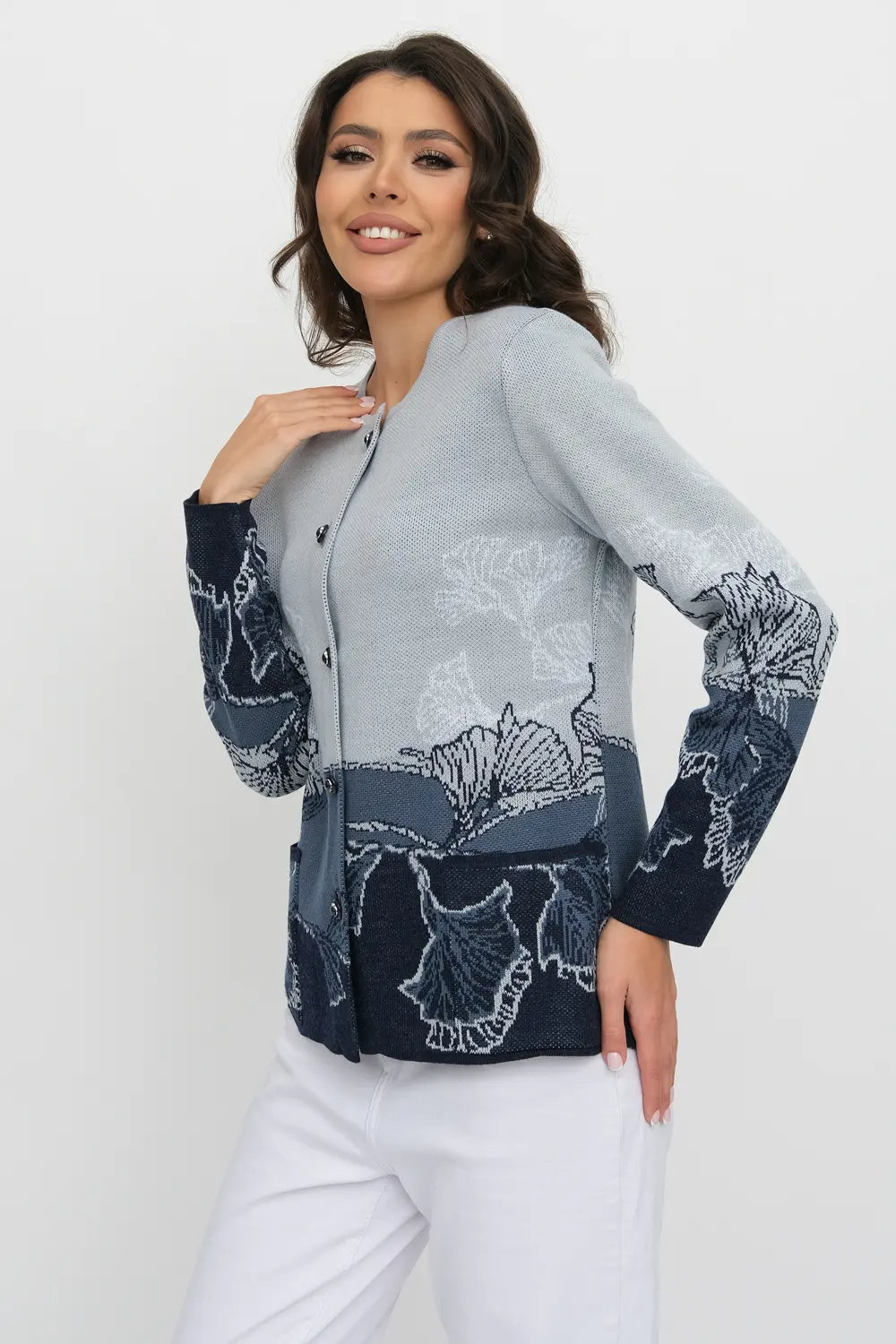 Женский трикотажный жакет полуприлегающего силуэта. Рукава втачные длинные. Жакет застегивается на пуговицы, горловина круглая. Два прорезных кармана. Изделие выполнено жаккардовым переплетние образующим геометрический рисунок "ромб" джинс