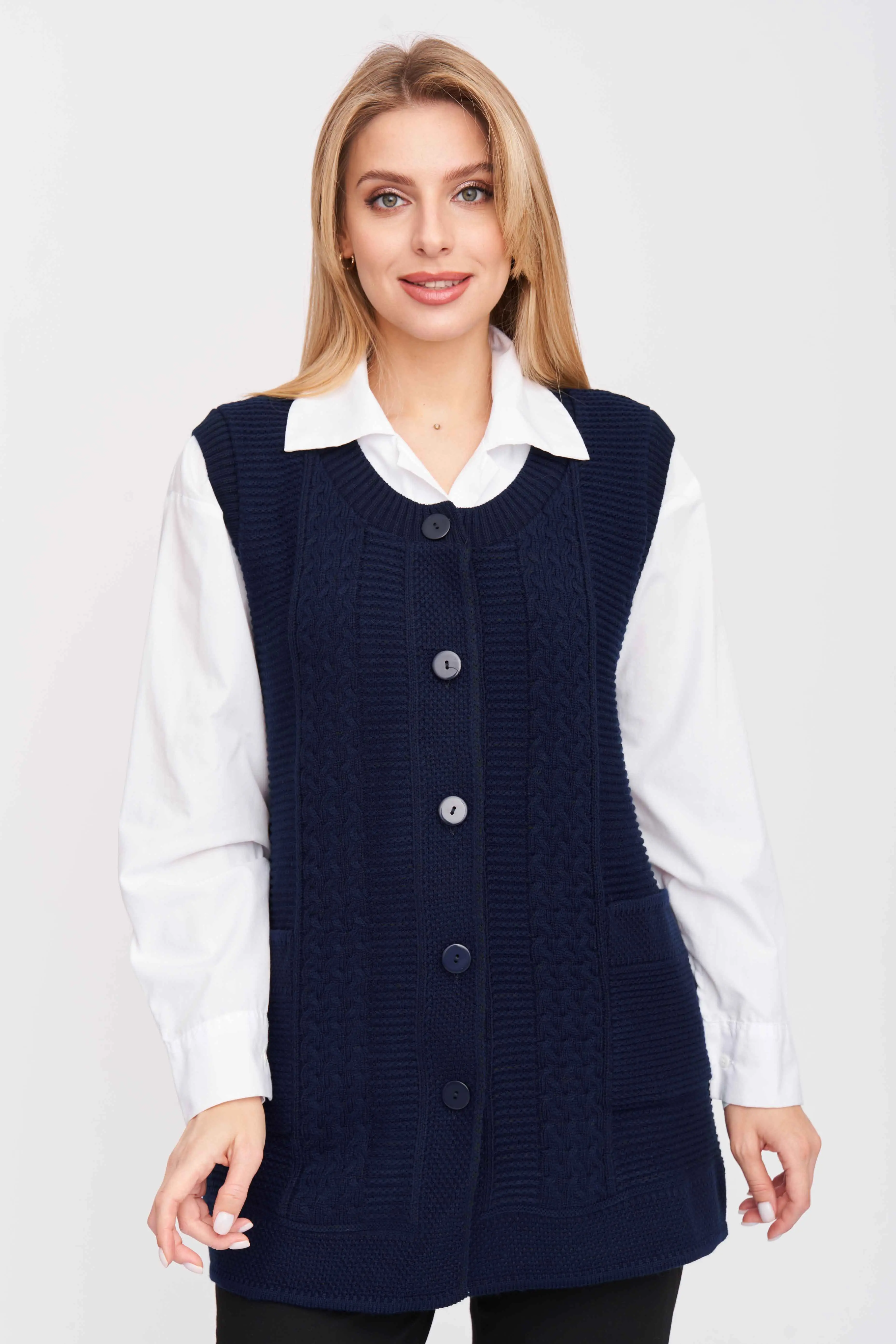 Женский вязаный удлиненный жилет на пуговицах по всей длине с круглой горловиной выполнен из высококачественной пряжи.  Жилет выполнен переплетением, образующим рельефный рисунок. Имеется два накладных кармана. Горловина и проймы изделия обработаны эластичным переплетением. Полуприталенный крой модели подойдет для любого типа фигуры и дополнит образ в сочетании с любой одеждой. синий