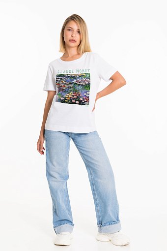 Футболка из однотонной кулирки, 100% хлопок. С коротким втачным рукавом и притачной планкой по горловине. Спереди нанесён принт.