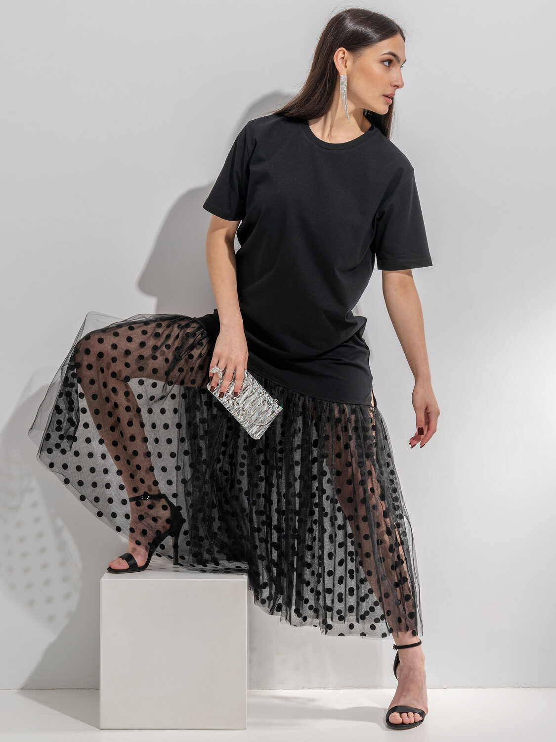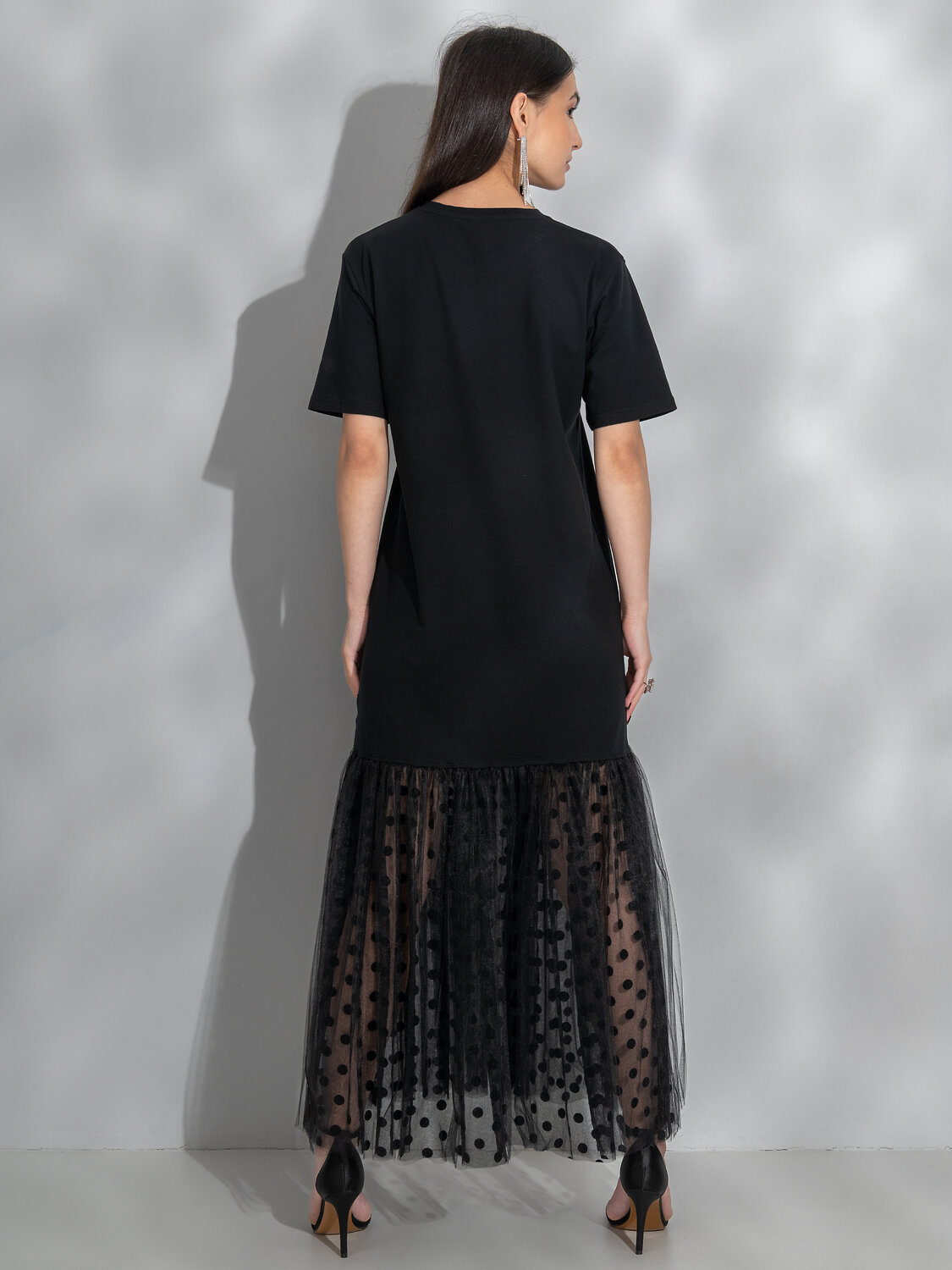 Длинное платье Oversize из легкого хлопкового полотна с лайкрой. Изделие с короткими рукавами со спущенным плечом. По низу многослойная пышная оборка из сетки. Уход: только деликатная стирка при температуре 40 градусов, без предварительного замачивания.
