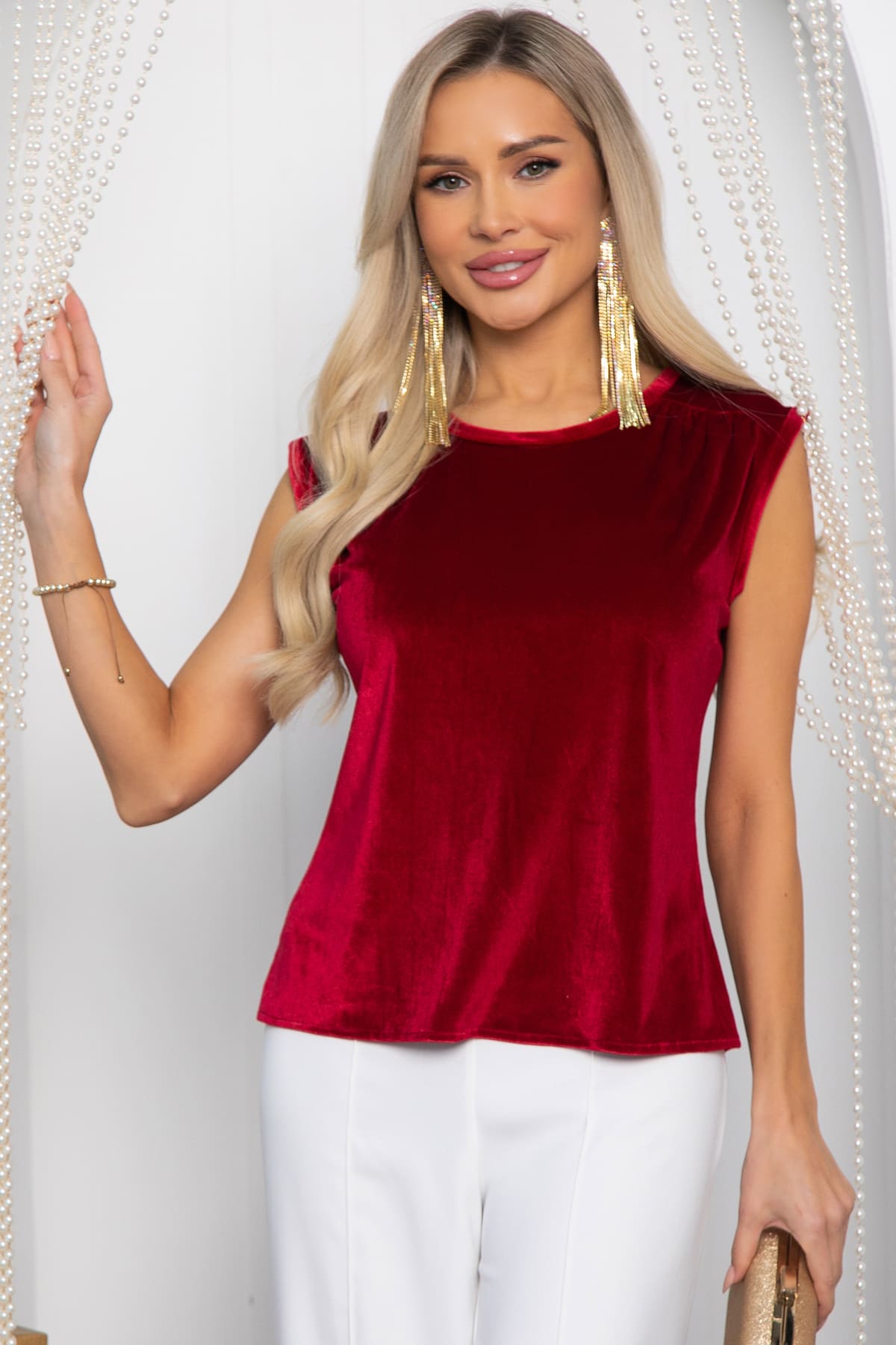 Оригинальная женская блузка станет незаменимой вещью в вашем гардеробе. Она подойдет для любого сезона и легко впишется в повседневный, вечерний или деловой стиль. Блузка из трикотажного бархата полуприлегающего силуэта, имеет округлую горловину, украшена кокеткой со сборкой. Ткань отлично тянется и обеспечивает идеальную посадку по фигуре. Безрукавная блузка выглядит дорого и стильно. Она изготовлена из высококачественного бархата, который не скатывается, сохраняет форму и цвет.