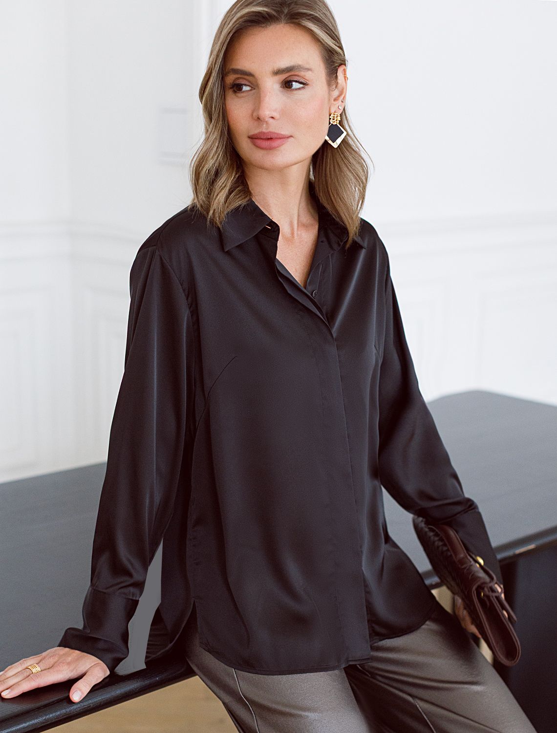 Сатиновая блузка с эластаном в черном цвете – воплощение элегантности и комфорта. Благородный блеск сатина добавляет образу шика, а эластичность материала гарантирует удобство при носке. Прямой силуэт блузки обеспечивает комфорт, а эластичность материала предотвращает деформацию. Застежка-планка с потайными пуговицами придает модели аккуратность. Универсальный вариант для casual-образов.
