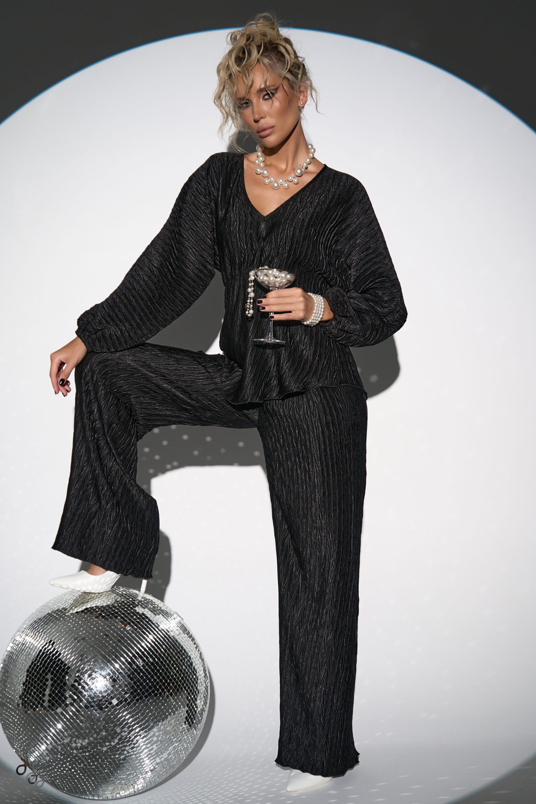 Свободный крой и плиссировка создают элегантный силуэт, а широкие брюки и длинные рукава добавляют образу женственности.Благодаря универсальному дизайну, он подходит как для повседневной носки, так и для вечерних выходов.Костюм выполнен из плиссированной ткани, которая не просвечивает и практически не мнётся. Мы выбрали  эту ткань потому что она создает интересную и динамичную фактуру, которая придаёт образу оригинальность и прекрасно смотрится на любой фигуре. Отлично сочетается с брюками “Маклен”