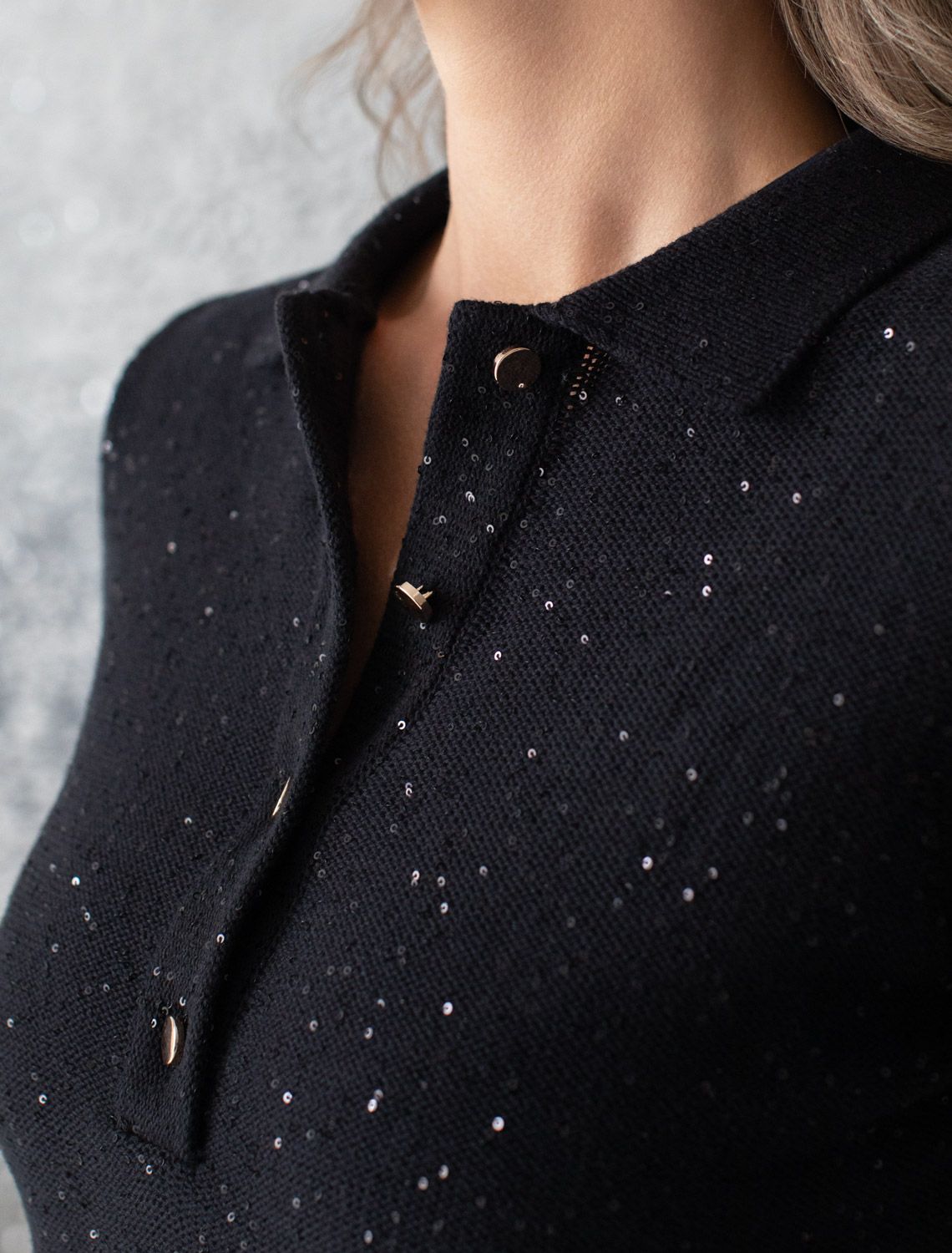 Легкий джемпер поло черного цвета с коротким рукавом выполнен из хлопковой пряжи с вкраплением сияющих пайеток, что придает особую изысканность. Стильный джемпер связан изнанкой, пряжа отличается легкостью и приятной текстурой, совершенно не колется, обеспечивает комфорт даже при длительном использовании, а натуральные волокна поддерживают оптимальный температурный баланс. Крой полуприлегающий, подчеркивает женственный силуэт, а отложной воротничок с застежкой на золотистые пуговицы и манжеты на рукавах гармонично завершают дизайн, создающий аккуратный образ. Нарядный джемпер подойдет девушкам и женщинам больших размеров, в нем вы будете чувствовать себя уверенно и свободно в любой ситуации. Мерцающий эффект пайеток добавляет образу выразительности и индивудуальности. Сочетайте джемпер в романтическом образе с пышной юбкой, в более строгом с широкими брюками. С этим поло легко создать премиальный лук в стиле old money. Мерцающее полотно добавляет особого шарма вашему образу, делая его уместным как на праздник, так и для повседневного выхода. Новый год, вечеринка или любое другое мероприятие пройдут ярко — сияющие пайетки создают ощущение праздника в каждом движении.