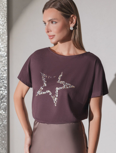 Футболка кофейного цвета идеально подходит для вечеринки и создания яркого образа. Оригинальный принт из блестящей фольги в виде звезды придает изделию шикарный вид, который привлечет внимание на любом мероприятии. Модель с вырезом лодочка и цельнокроеным рукавом обеспечивает свободу движений и комфорт в носке. Такой фасон изделия подходит на большие размеры, гармонично сидит на фигуре и помогает создать легкий акцент на достоинствах. Благодаря особенностям кроя с цельнокроеным рукавом удается искусно скроет любые возможные недостатки в области плеч и рук, обеспечивая комфортное прилегание без ощущения скованности. Аккуратный вырез лодочка красиво подчеркивает шею и делает образ элегантным, сохраняя актуальность для разных случаев — от рабочих встреч до вечерних прогулок и праздничных мероприятий.
