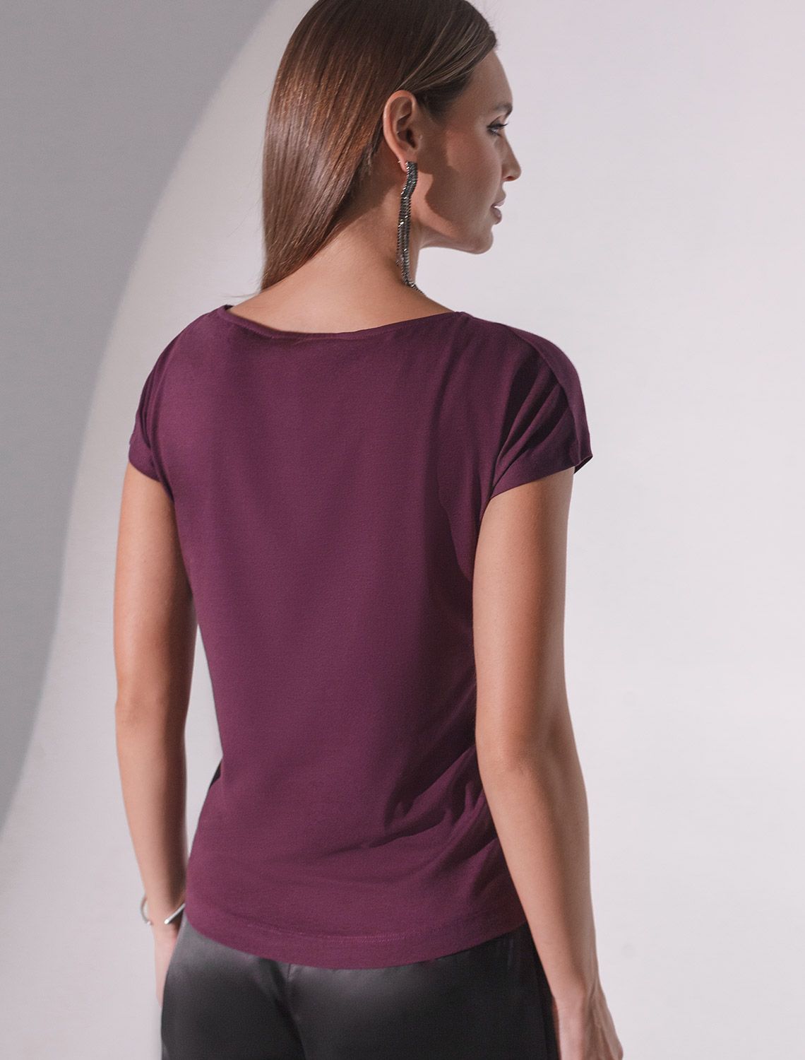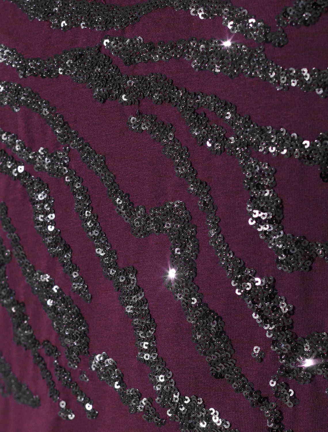 Футболка цвета бургунди идеально подходит для вечеринки и создания яркого образа. Оригинальный блестящий принт из пайеток серебристого цвета в виде зебры придает изделию шикарный вид, который привлечет внимание на любом мероприятии. Модель с вырезом лодочка и цельнокроеным коротким рукавом обеспечивает свободу движений и комфорт в носке. Такой фасон изделия подходит на большие размеры, гармонично сидит на фигуре и помогает создать легкий акцент на достоинствах. Аккуратный вырез лодочка красиво подчеркивает шею и делает образ элегантным, сохраняя актуальность для разных случаев — от рабочих встреч до вечерних прогулок и праздничных мероприятий.