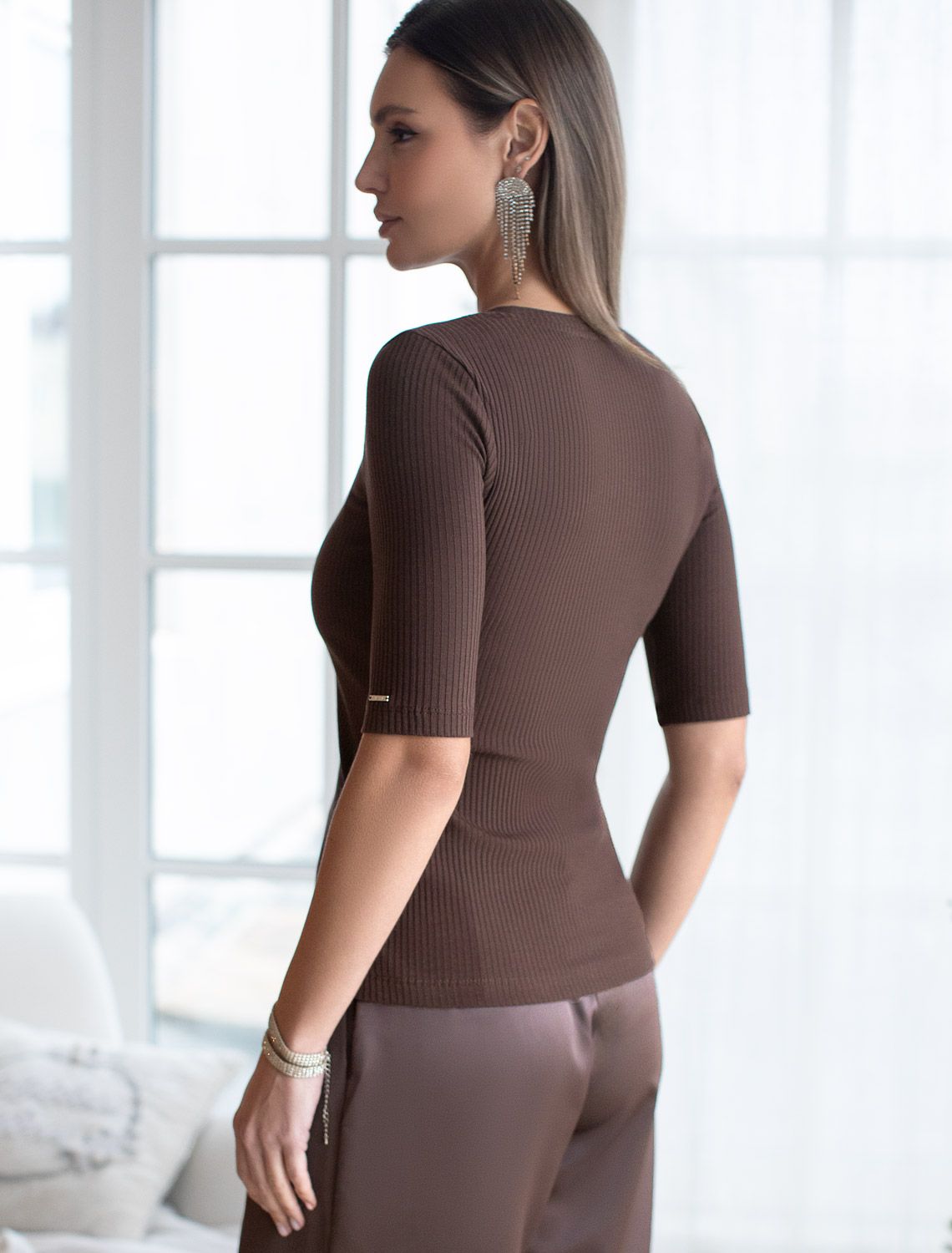 Футболка выполнена из трикотажа в широкий рубчик. Базовая модель с круглым вырезом и рукавом до локтя. Эластичный хлопковый трикотаж сидит по фигуре, не сковывает движений и очень комфортный в носке. Фактура вертикальных полос визуально стройнит и вытягивает силуэт. Базовое изделие хорошо впишется в любой гардероб. Идеально подходит для многослойных образов в базовый гардероб.