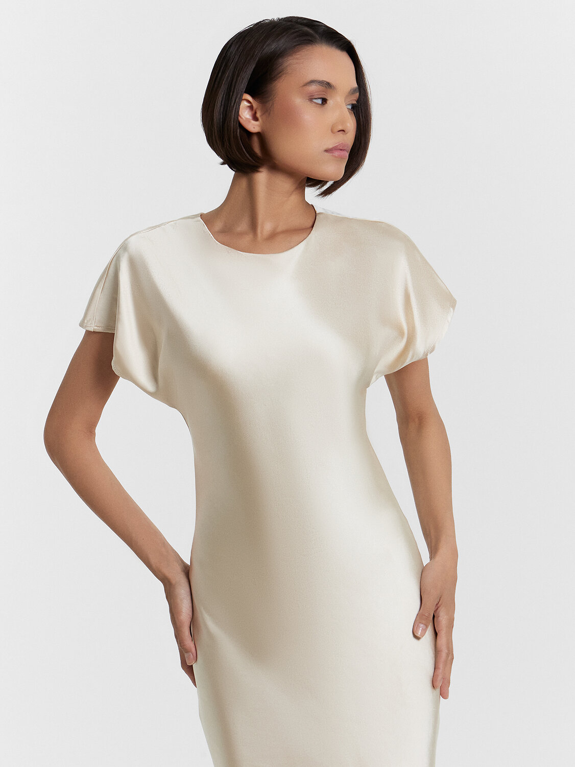 Платье полуприлегающего силуэта длиной миди идеально подойдет для различных повседневных и нарядных образов. Круглая горловина и короткие рукава придают ему универсальный и стильный вид. А застежка на пуговицу на спинке добавляет элегантности и удобства. Изделие выполнено из высокопрочного материала, приятного к телу, что обеспечивает комфорт и долговечность. Такая ткань будет держать форму и радовать вас своим качеством. Прекрасный выбор для тех, кто ценит стиль и комфорт в одежде!