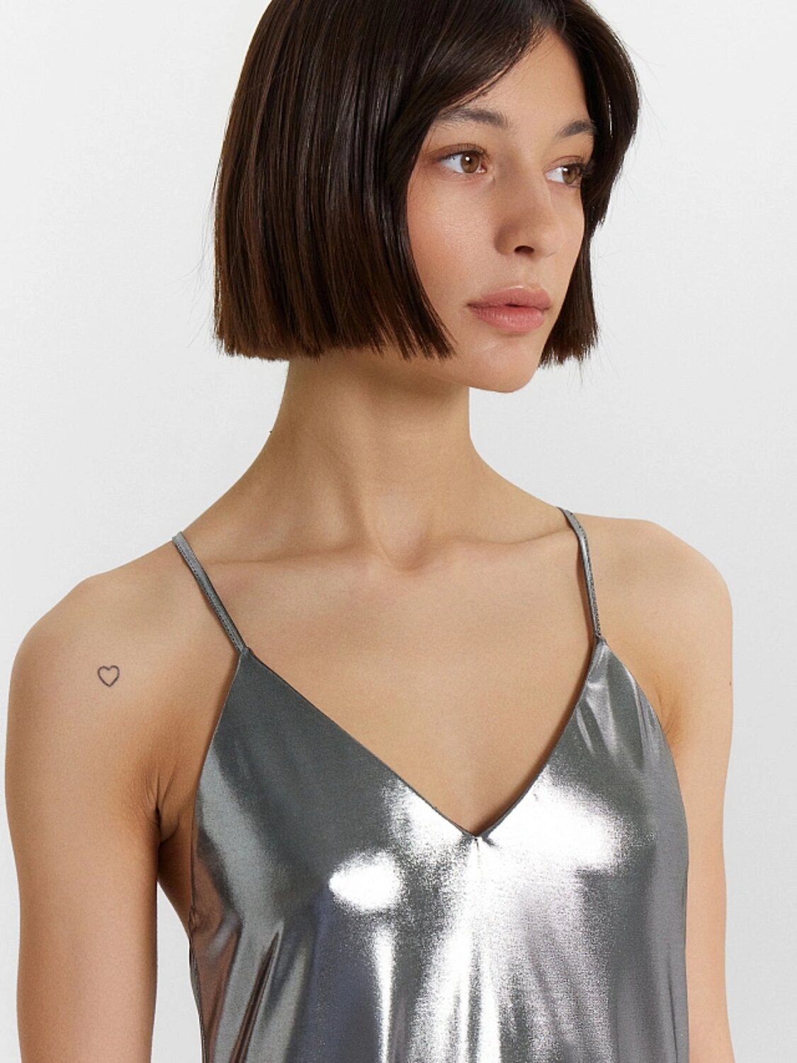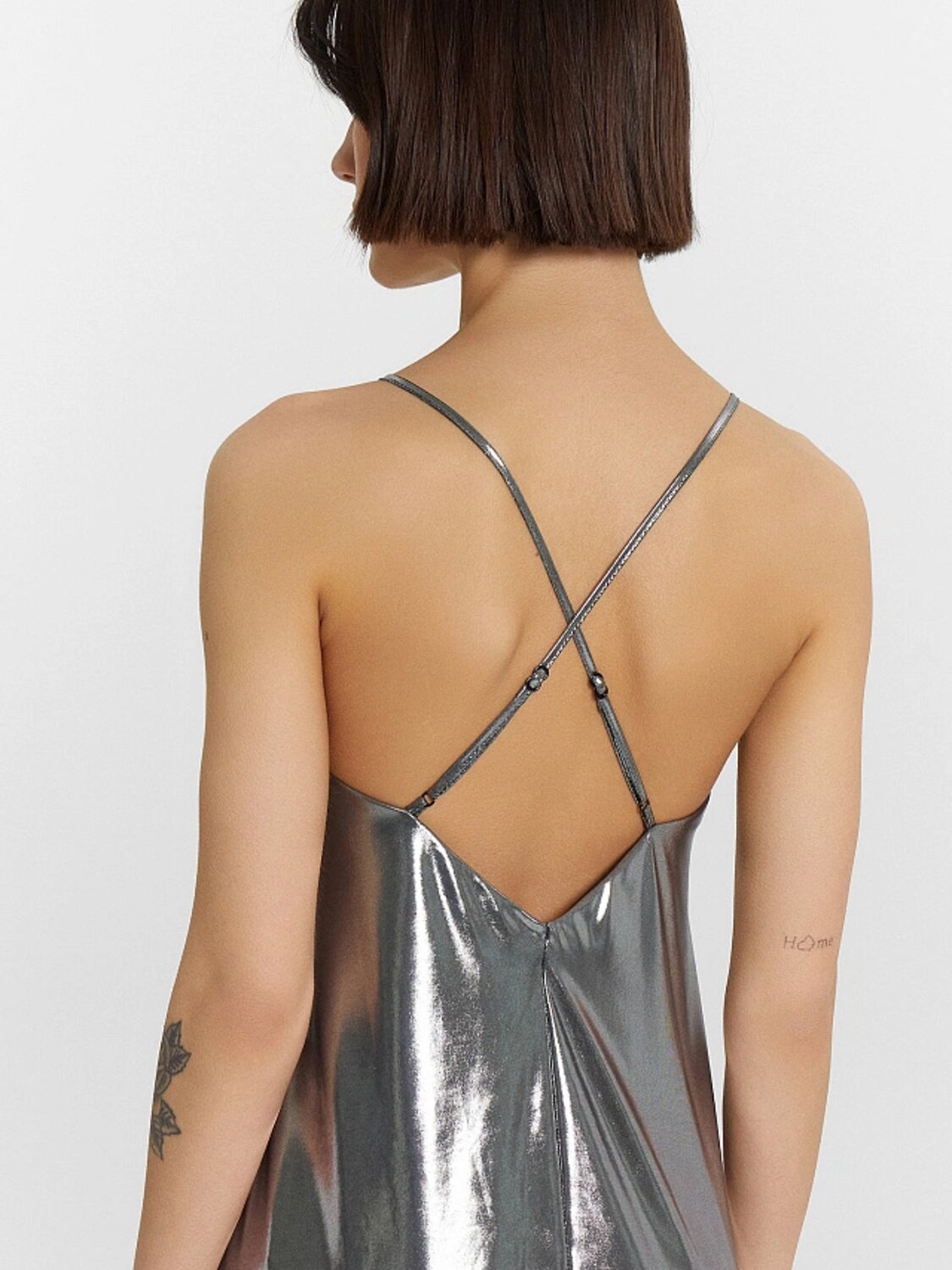 Эффектное платье макси — идеальный выбор для элегантного и женственного образа. Полуприлегающий силуэт подчеркивает фигуру, а регулируемые бретели позволяют подобрать комфортную посадку. V-образная горловина добавляет изящности, а глубокий вырез на спинке делает модель особенно выразительной. Укороченная подкладка создает легкость и воздушность, а аккуратная обработка нижнего среза обеспечивает безупречный вид. Это платье отлично подойдет для торжественных мероприятий, романтических встреч или стильных прогулок.