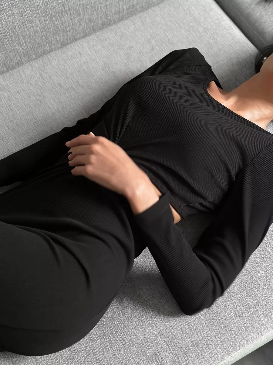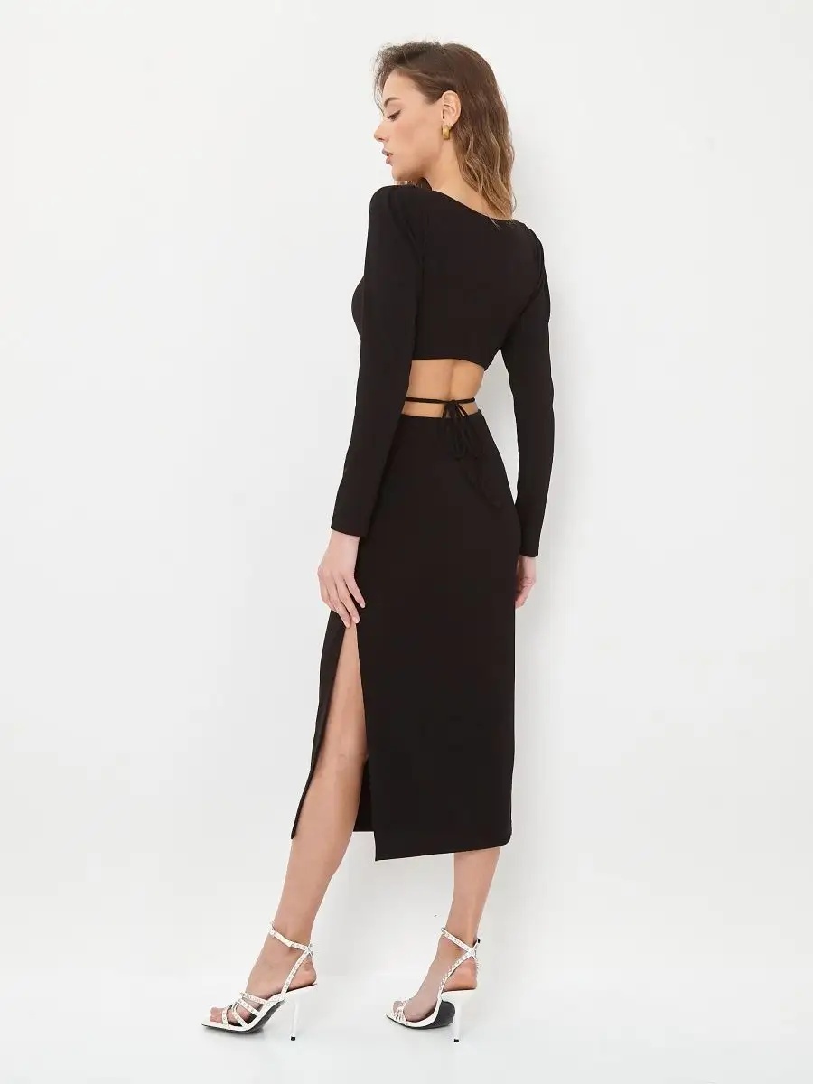 Платье прилегающего силуэта с декоративными вырезами в области талии, выполнено из трикотажного полотна с разрезом в боковом шве. Спинка отрезная по линии талии. Перед с перекрутом нижней части относительно верхней и декоративным узким пояском. Рукава полуреглан со сборкой в верхней части.