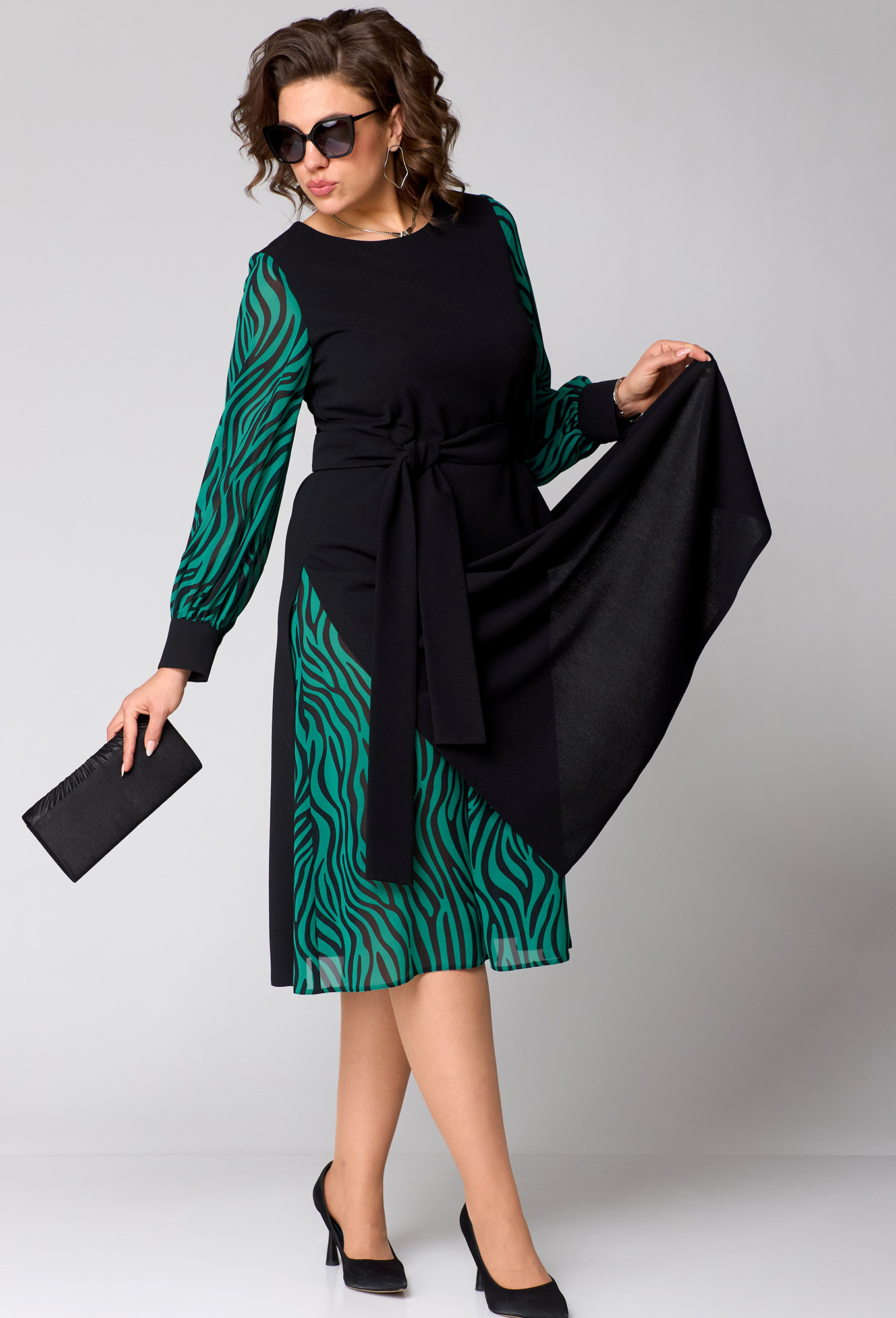 Модель: ЕВА ГРАНТ 7229Е чёрно-зелёный..показать Рост: 170 см (девушка на фото ростом 170см) Сезон: Круглогодичный Тип ткани: Полиэстер 74%, Вискоза 21%, Спандекс 5%Платье женское нарядно-повседневное полуприлегающего силуэта выполнено из плательного крепа в сочетании с шифоном. Вырез горловины круглый обработан обтачкой, по спинке застежка на одну навесную петлю и пуговицу, рукав втачной из шифона по низу со сборкой на притачной манжете. Платье отрезное по талии с двойной юбкой (верхняя юбка из крепа, нижняя с шифона). По боковым швам верхней юбки длинные разрезы. Декором служат шифоновые детали и съемный почяс из основной ткани.