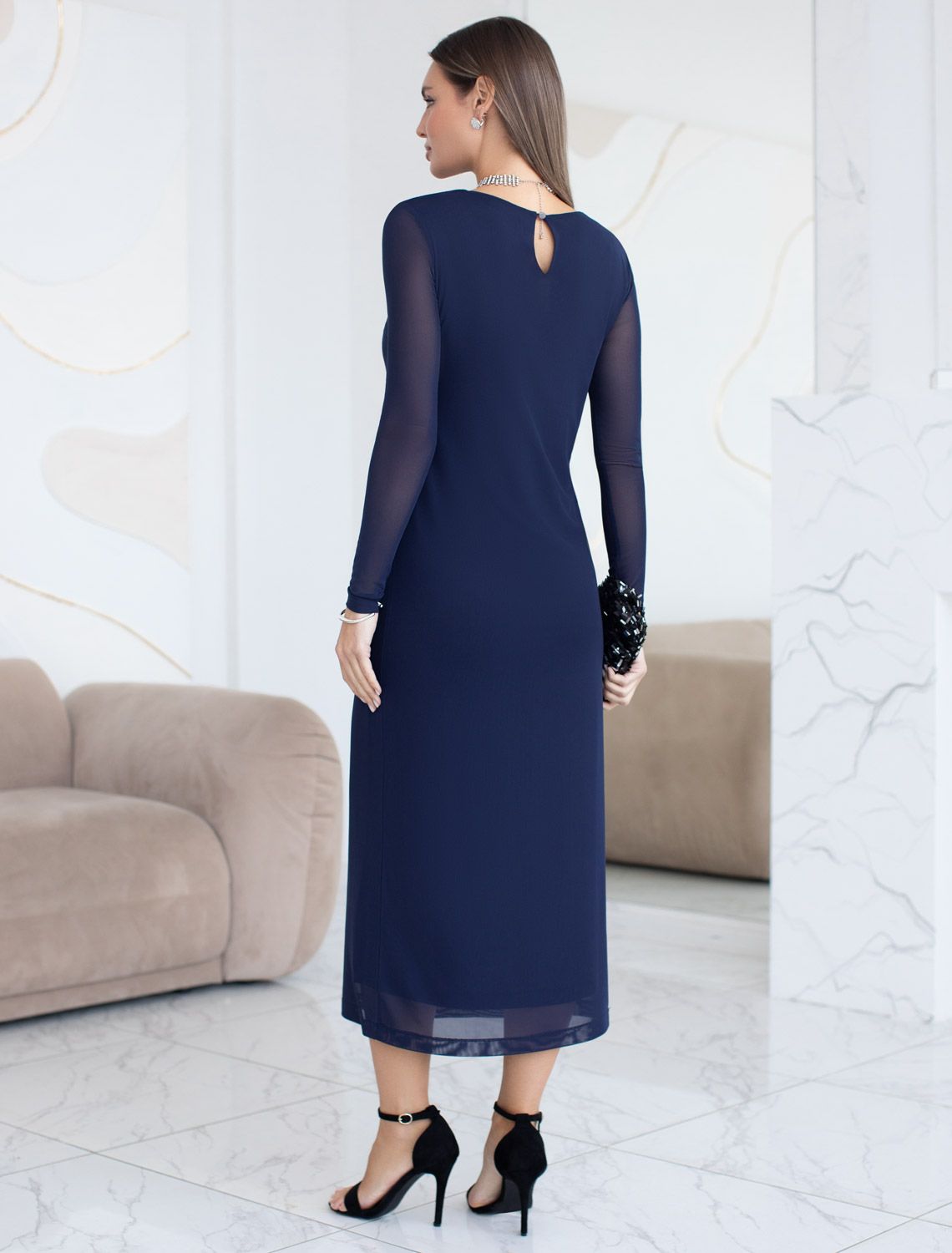Модель выполнена из воздушной сетчатой ткани с вискозной подкладкой, которая подчеркивает фигуру. Прямой крой создает стройный силуэт. Богатый темно-синий цвет создает эффект глубины и роскоши. Прозрачные рукава добавляяют образу пикантности. Идеально подходит как для вечерних выходов, так и для повседневного образа. 95%ПЭ 5%ПУ, ПОДКЛАДКА: 95%Вис 5%ПУ