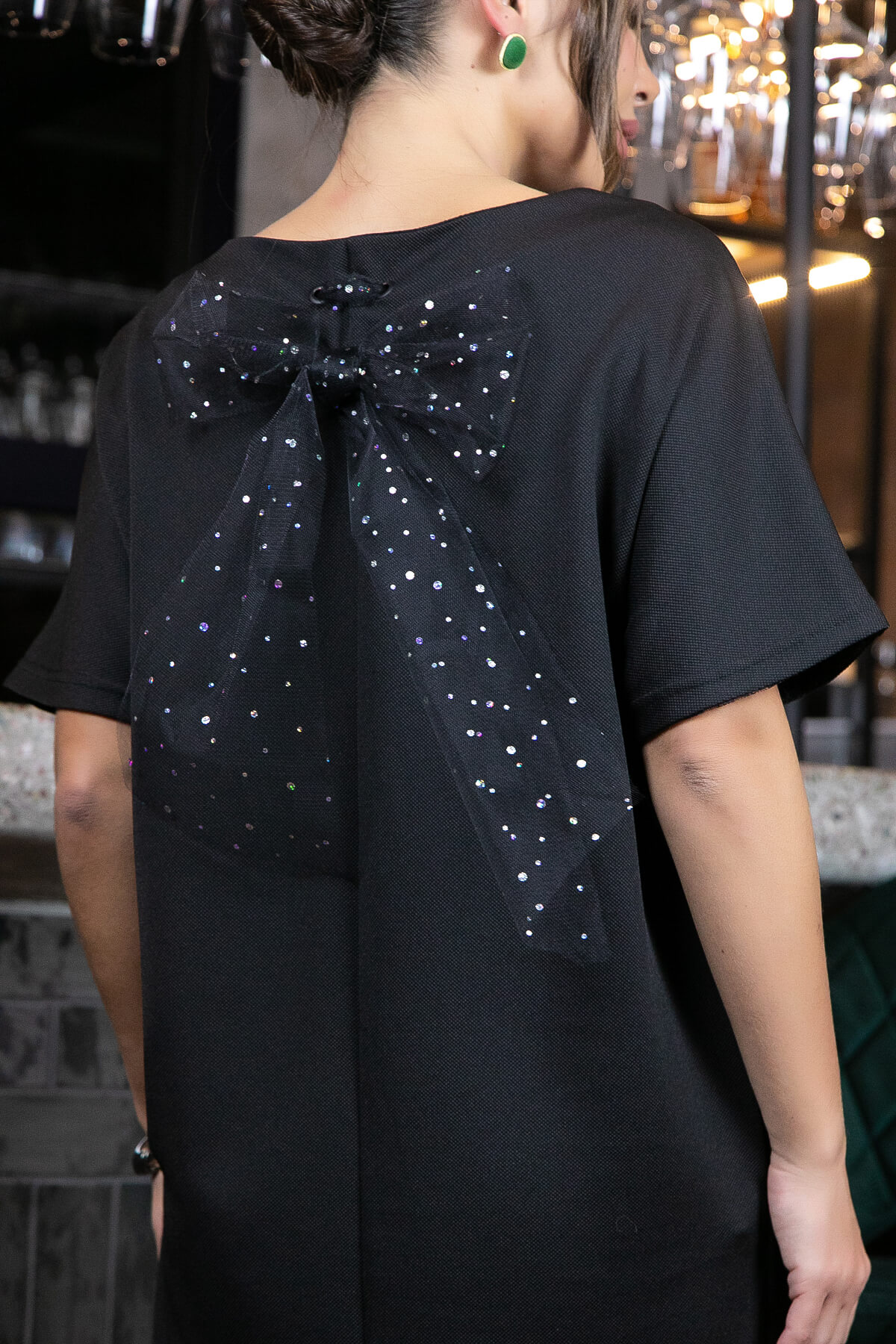 Стильное платье силуэта "бочонок", длиной выше колена, с рукавом три четверти. Спинка у платья украшена красивым бантом с блесками. Такое платье универсально, ведь оно уместно в совершенно разных ситуациях. Подходит женщинам, девушкам и подросткам с любым ростом, беременным и мамам на выписку, идеально смотрится как на торжественном мероприятии, так и в повседневной жизни благодаря игре аксессуаров.