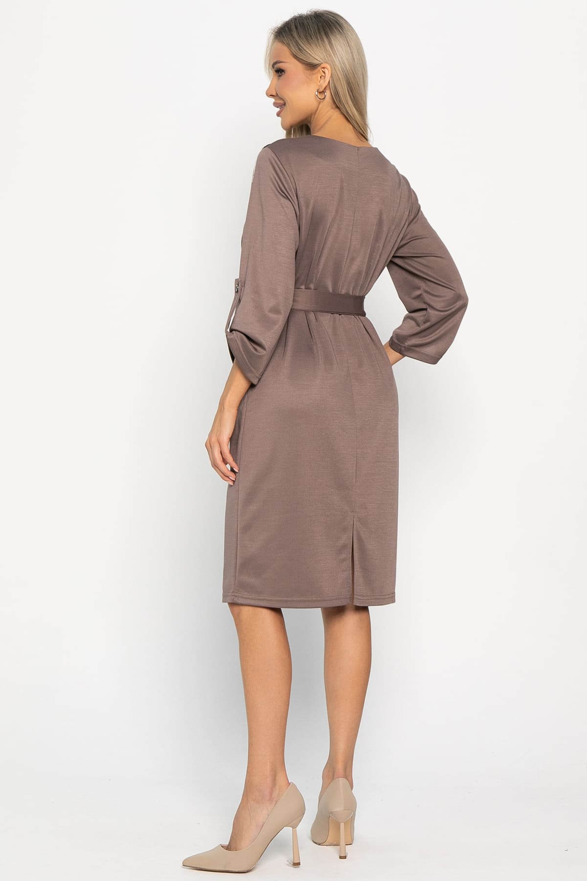Изящное платье прямого кроя станет отличным дополнением вашего гардероба. Платье оснащено округлой горловиной и рукавами 3/4 на пате с пуговицей, обеспечивая комфорт и элегантность. Разрез по заднему полотнищу позволяет свободно двигаться. Платье декорировано лентой с цепочками на плече и пуговицами, украшенными стразами. В комплекте идет пояс из основной ткани, который поможет подчеркнуть талию и создать гармоничный силуэт.