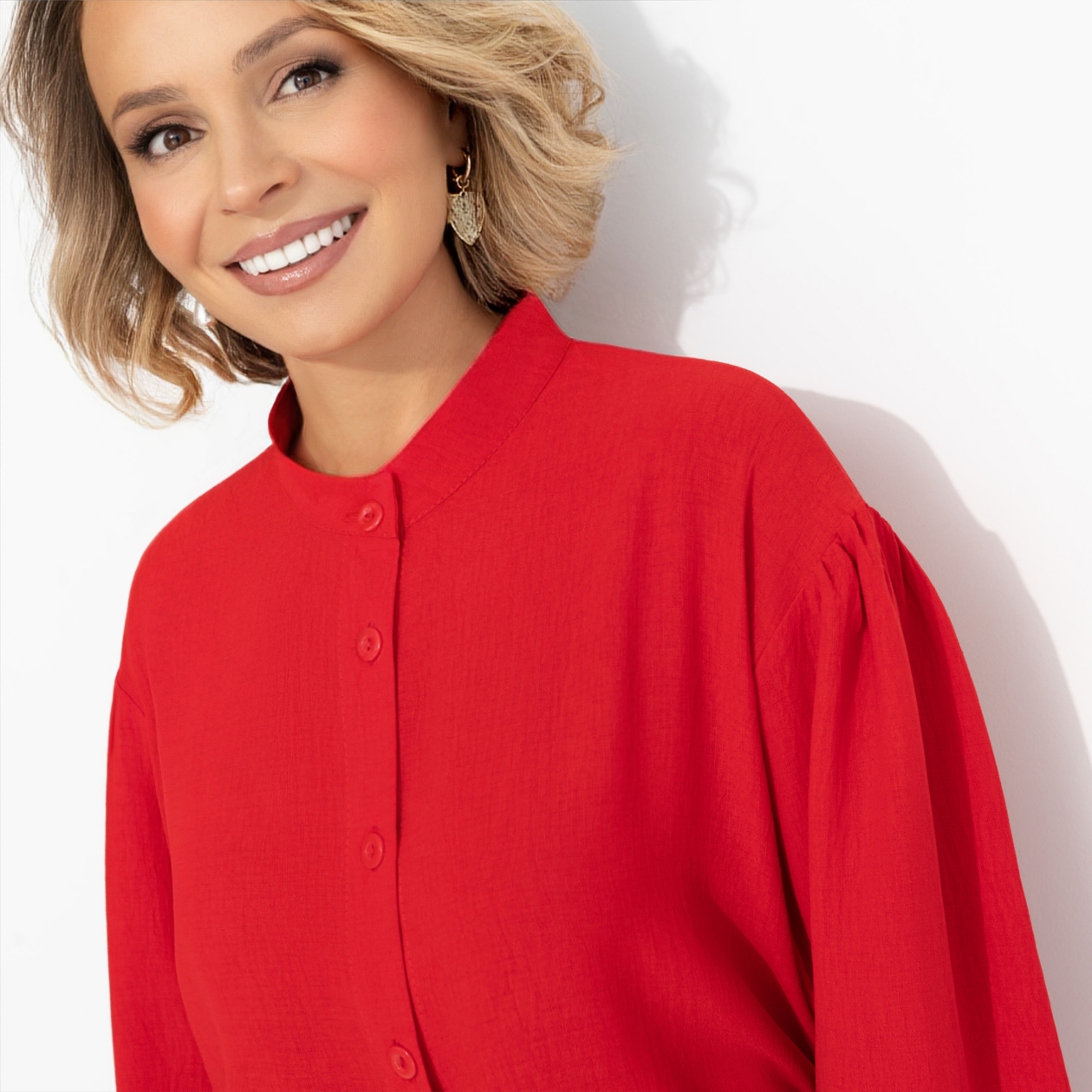 Осень в ритме фламенко! Красная рубашка ЧАРУТТИ из новой коллекции согревает взгляд и дарит энергию даже в самые хмурые дни. Тот случай, когда знойный характер Андалусии встречается с комфортом осени. Авангардная рубашка из плотной ткани алого оттенка. Акцентная спинка с разрезом и кружевом. Объёмные рукава, асимметричный низ и боковая сборка добавляют драматизма. Для тех, кто любит фантазию в базовом гардеробе.