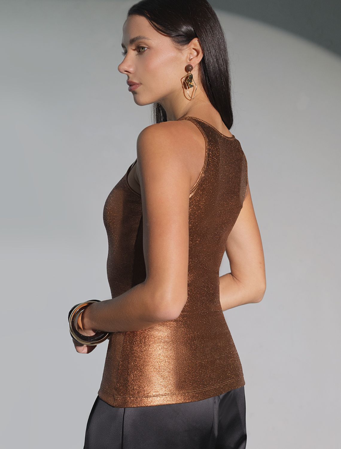 Эффектный топ кофейного цвета из мягкого хлопка с эластаном представлен в стильном исполнении с матовым бронзовым покрытием металлик с серебристыми вкраплениями. Мелкий рубчик визуально вытягивает силуэт и подчеркивает фигуру, делая образ более стройным и аккуратным. Круглый ворот и суженные лямки акцентируют внимание на линии ключиц, делая образ утонченным и изысканным, Благодаря деликатному блеску топ подходит для тех, кто ценит утонченность и стремится добавить в образ немного сияния без перебора - это отличный вариант топа для любительниц минимализма.