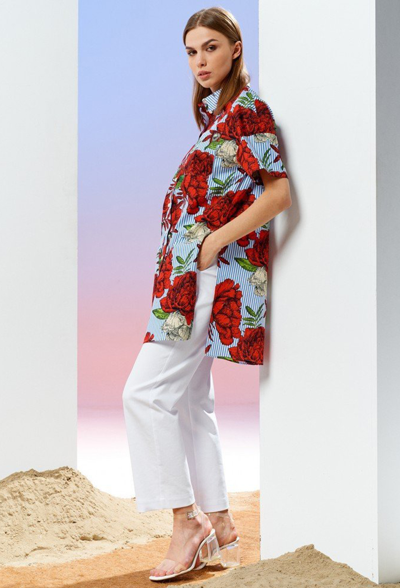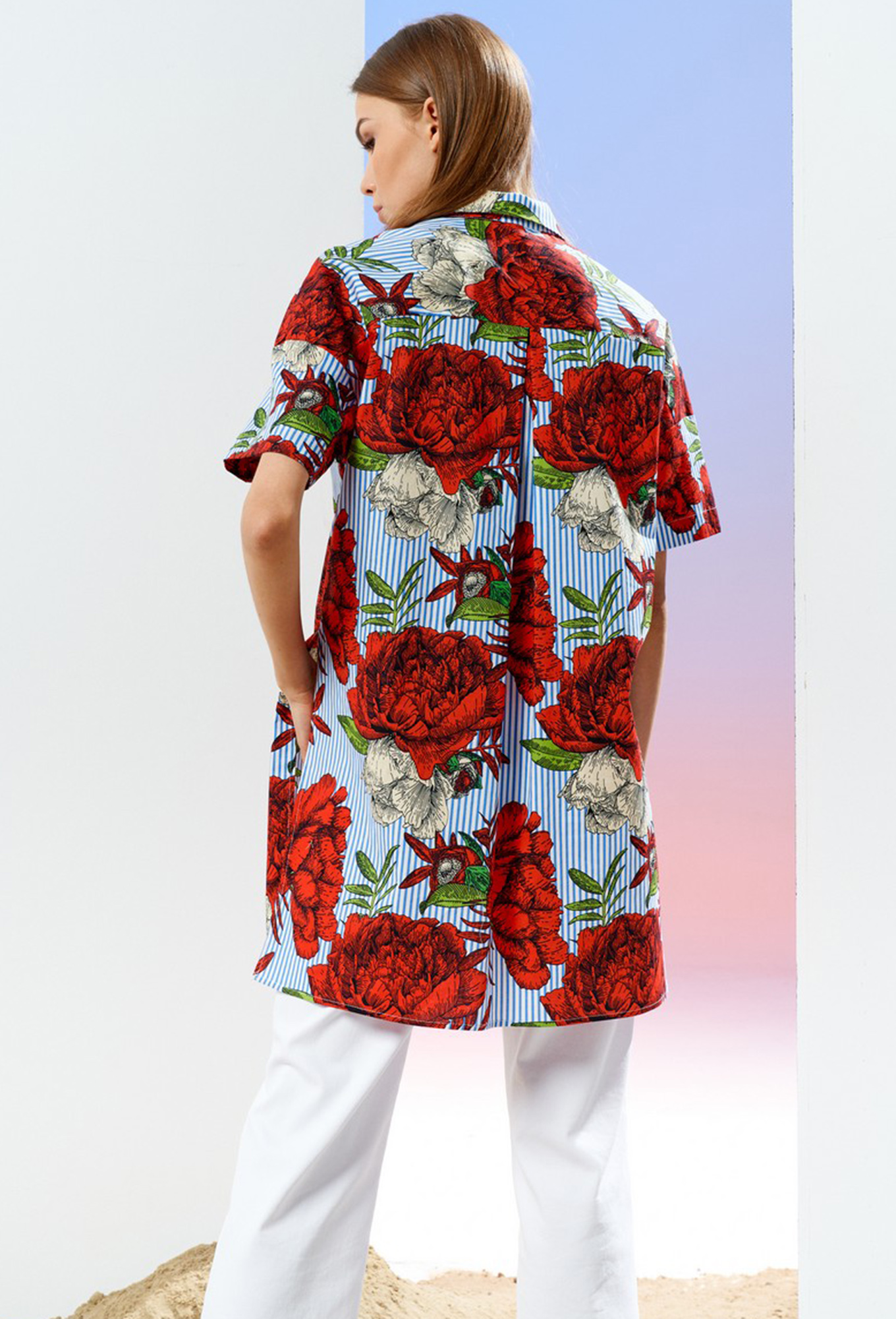 Рубашка прямого силуэта из хлопка с принтом. Рубашечный воротник. Рукава одношовный втачной длиной ¾ , спереди накладные кармашки, по бокам разрезы . По спинке отрезная кокетка и от нее по центу встречная складка. Застегивается на планку с пуговицами.