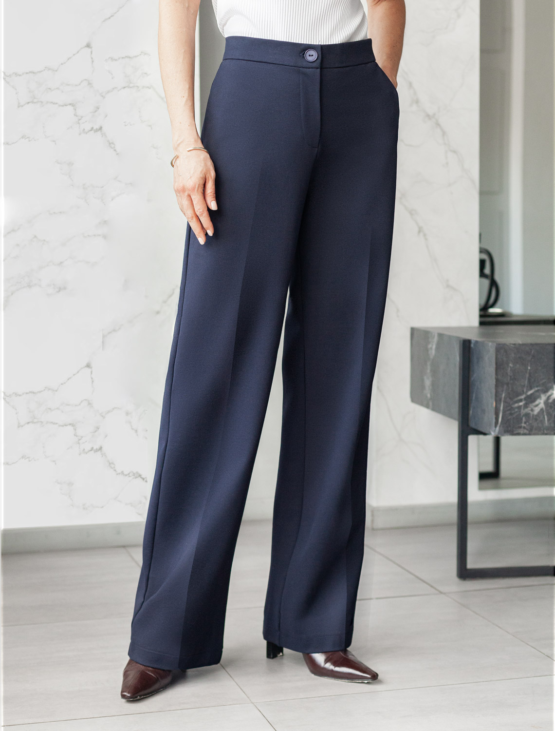 Прямые брюки выполнены из трикотажа джерси средней плотности. Модель дополнена боковыми карманами и поясом на резинке сзади. Заутюженные стрелки визуально вытягивают силуэт. Изделие хорошо держит форму, отлично тянется и почти не мнется во время использования. Идеальный вариант в офис или в повседневный классический стиль.