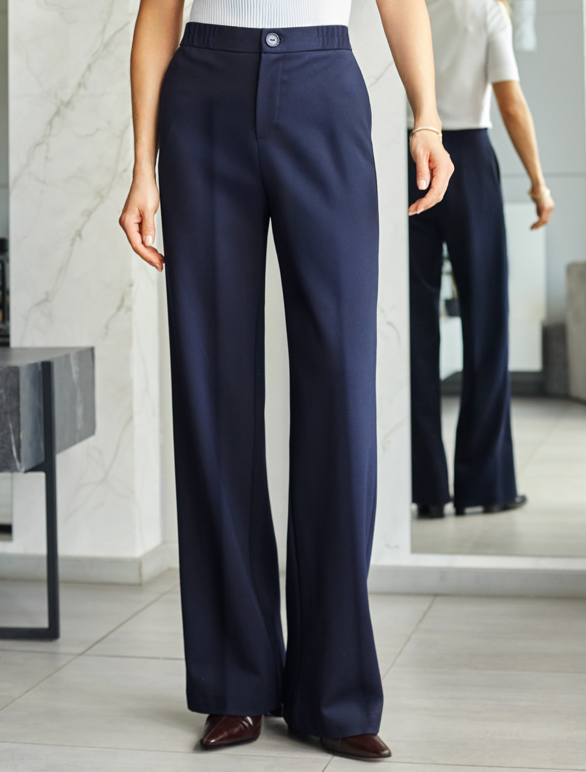 Прямые брюки выполнены из трикотажа джерси. Модель дополнена боковыми карманами и поясом на резинке сзади. Заутюженные стрелки визуально вытягивают силуэт. Изделие хорошо держит форму, отлично тянется и почти не мнется во время использования. Идеальный вариант в офис или в повседневный классический стиль.