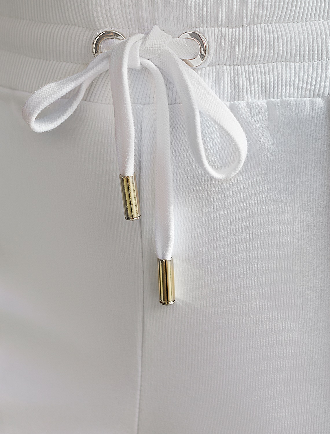 Брюки белого цвета прямого кроя выполнены из премиального футера-двухнитки. Лаконичный силуэт поддерживают застроченные стрелки, зрительно вытягивающие силуэт. Удобный пояс на резинке регулируется хлопковым шнурком с золотистой фурнитурой. Наличие эластана в составе изделия гарантирует комфорт и долговечность изделия. Эластичный материал хорошо пропускает воздух, позволяя телу дышать, и легко тянется, не ограничивая движения.