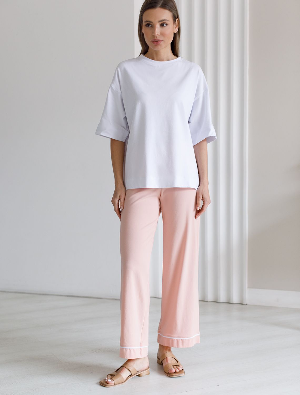 Прямые брюки из эластичного хлопка. Модель дополнена контрастным кантом по низу изделия. Самые мягкие волокна премиального хлопка гарантируют непревзойденный комфорт в течении всего дня. Эластан в составе изделия, поддерживает форму и препятствует сминаемости. Сочетается в костюме с блузкой D49.052 и D49.057 розовый