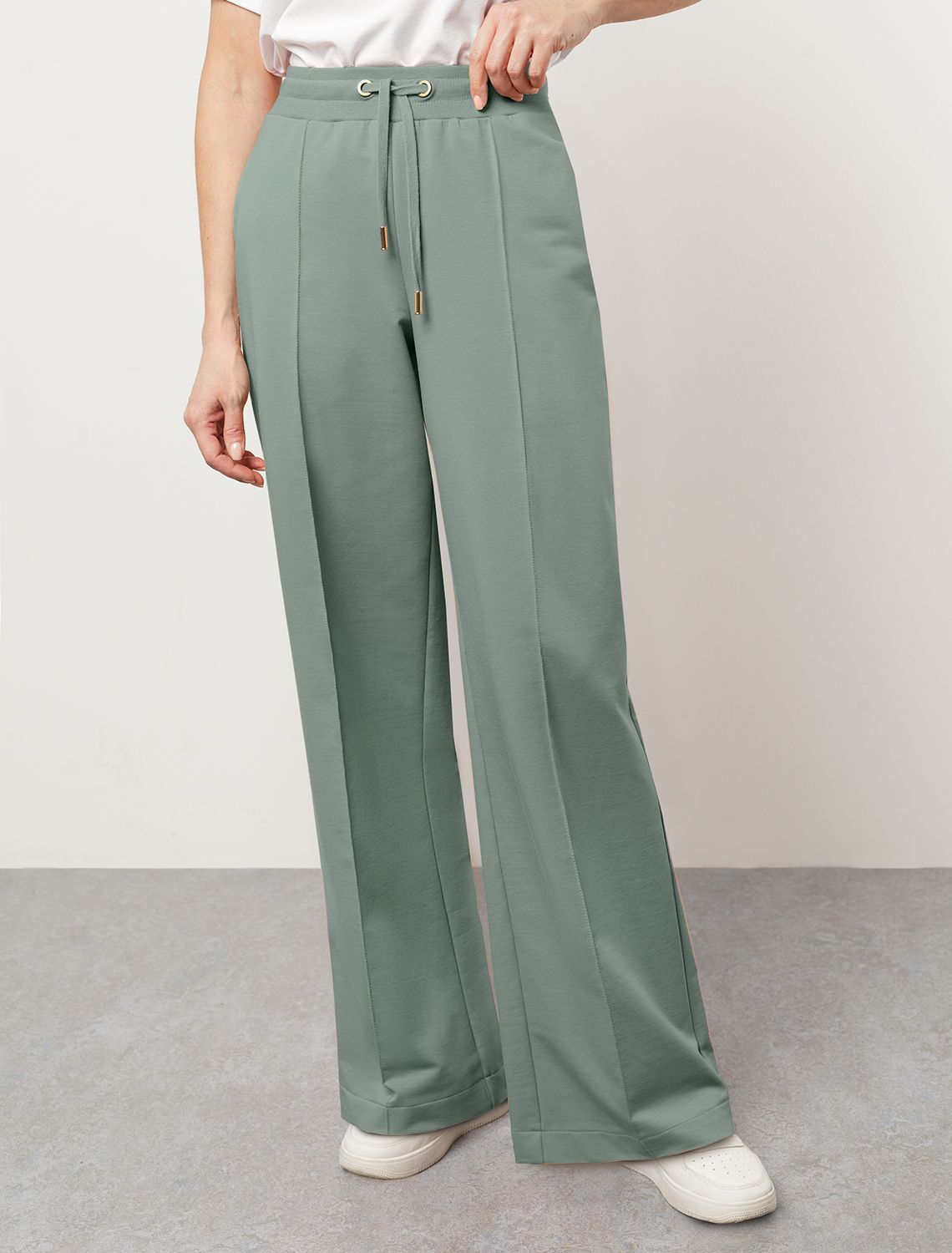 Брюки прямого кроя выполнены из премиального футера-двухнитки. Лаконичный силуэт поддерживают застроченные стрелки, зрительно вытягивающие силуэт. Удобный пояс на резинке регулируется хлопковым шнурком с золотистой фурнитурой. Наличие эластана в составе изделия гарантирует комфорт и долговечность изделия. Свободные брюки хорошо будут сочетаться в костюме с футболкой D49.074 и паркой D49.076 св.оливковый