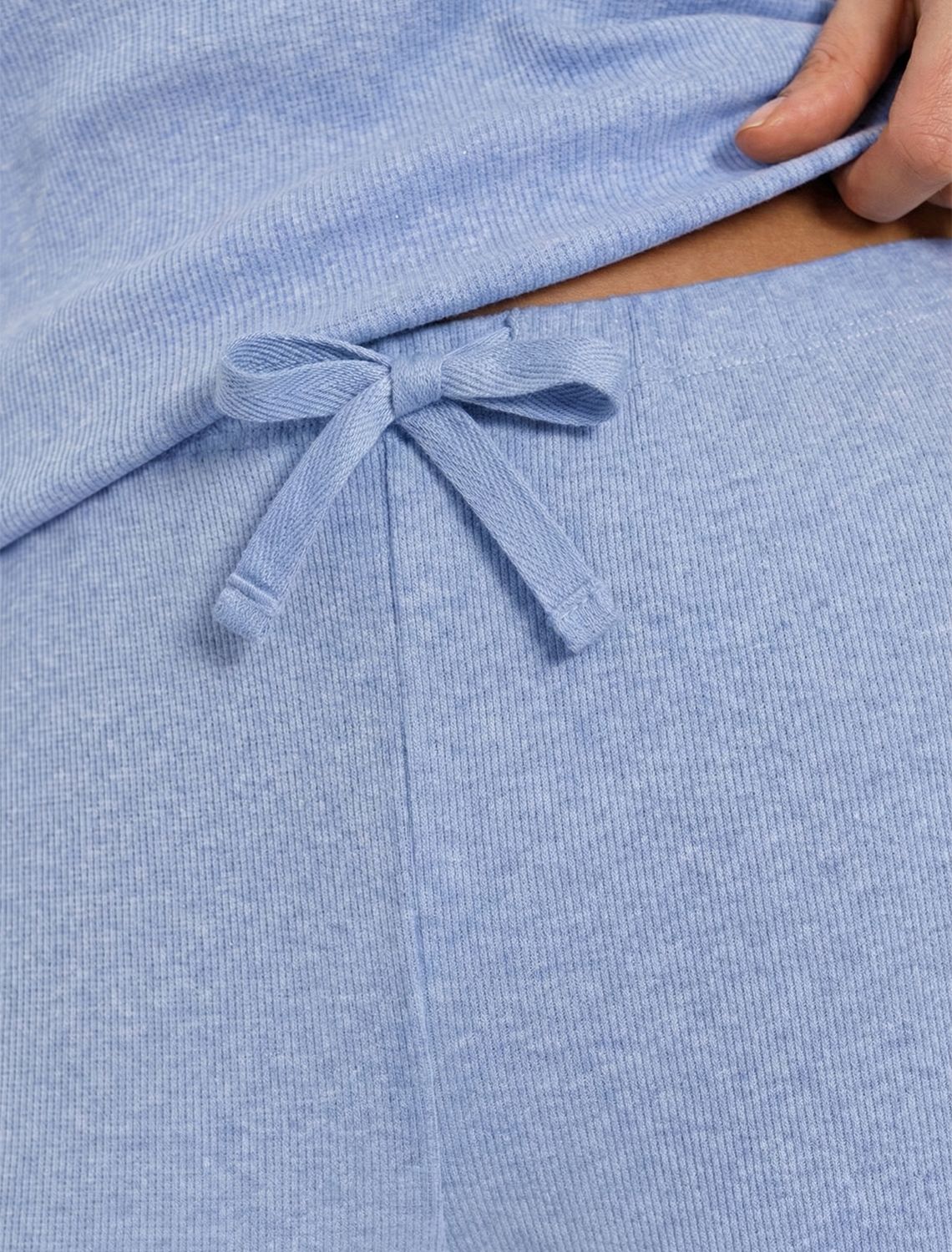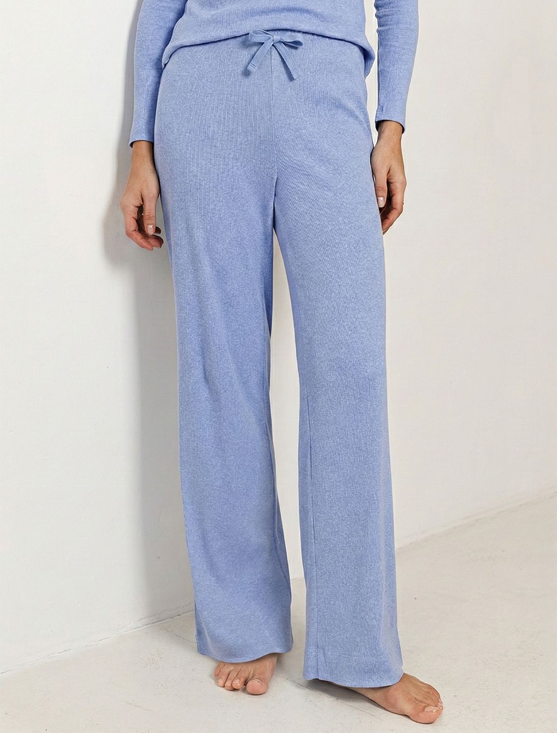 Прямые брюки голубого цвета с эффектом меланж с поясом на тонкой резинке из фактурного трикотажа в рубчик созданы для вашего ежедневного комфорта. Особенность полотна - трикотаж кашкорсе удивительной мягкости, намного мягче стандартных вариантов, подходящий для расслабленных домашних и пижамных образов. Хлопок обеспечивает максимальный комфорт даже в течение длительного времени и позволяет коже дышать, а эластан дарит безупречную посадку на различные типы фигуры, в том числе и большие размеры и позволяет свободно двигаться. Выбирая эти легкие штаны, вы получаете удобство и стиль в одном решении, ведь домашние и повседневные задачи будут проходить с максимальным комфортом. Красивые брюки сохранят свой внешний вид даже при активной эксплуатации, ткань не теряет форму. Брюки подходят для создания уютного образа на каждый день, легко сочетаются с другими предметами гардероба для прогулок и уютных вечеров. Приятная рельефная фактура ткани и аккуратный дизайн создают баланс между стилем и удобством, что особенно важно при выборе повседневных брючек.
