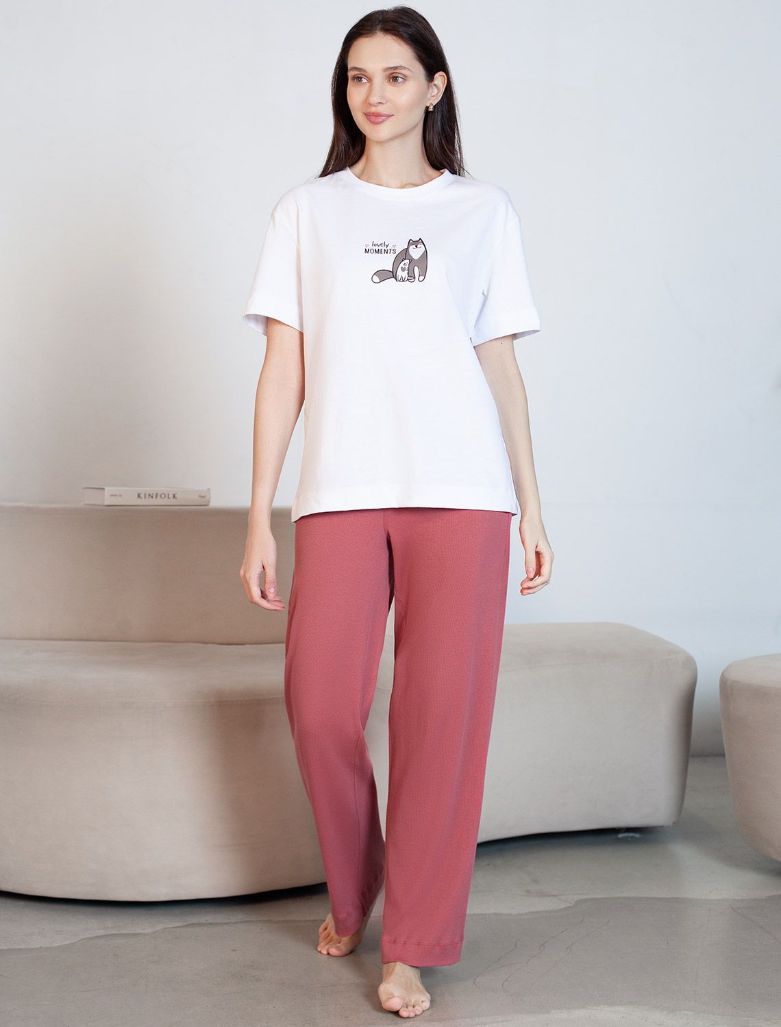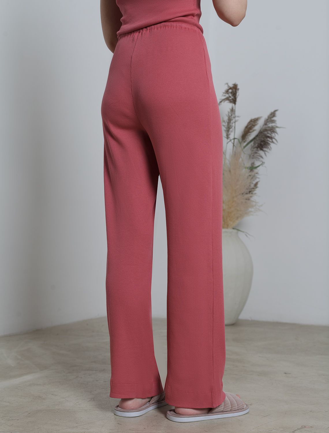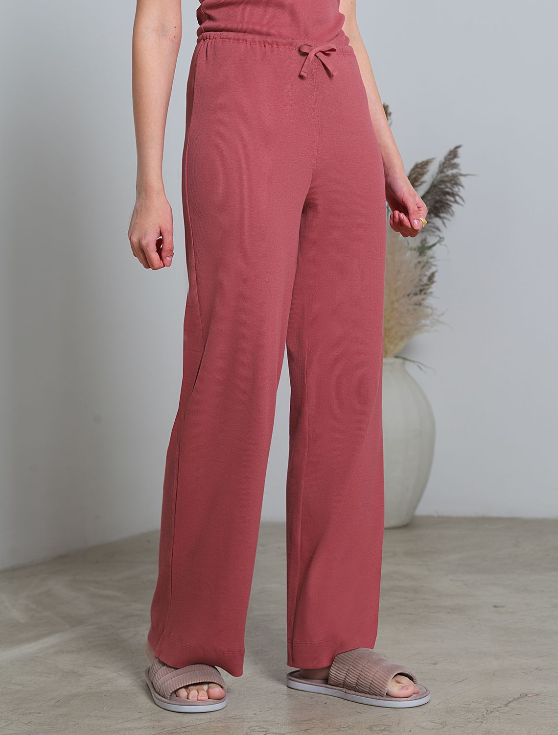 Прямые брюки темно-кораллового цвета с поясом на тонкой резинке из фактурного трикотажа в рубчик созданы для вашего ежедневного комфорта. Особенность полотна - трикотаж кашкорсе удивительной мягкости, намного мягче стандартных вариантов, подходящий для расслабленных домашних и пижамных образов. Хлопок обеспечивает максимальный комфорт даже в течение длительного времени и позволяет коже дышать, а эластан дарит безупречную посадку на различные типы фигуры, в том числе и большие размеры и позволяет свободно двигаться. Выбирая эти легкие штаны, вы получаете удобство и стиль в одном решении, ведь домашние и повседневные задачи будут проходить с максимальным комфортом. Красивые брюки сохранят свой внешний вид даже при активной эксплуатации, ткань не теряет форму. Брюки подходят для создания уютного образа на каждый день, легко сочетаются с другими предметами гардероба для прогулок и уютных вечеров. Приятная рельефная фактура ткани и аккуратный дизайн создают баланс между стилем и удобством, что особенно важно при выборе повседневных брючек.