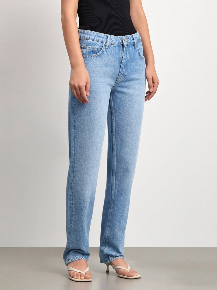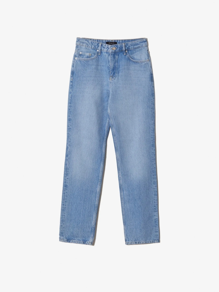 Голубые джинсы из качественного хлопка. Модель прямого кроя имеет высокую посадку. Застёгивается на молнию и пуговицу. Сзади располагаются накладные карманы. Спереди имеются два прорезных кармана по бокам. Базовые джинсы незаменимы в гардеробе и сочетаются с любым верхом