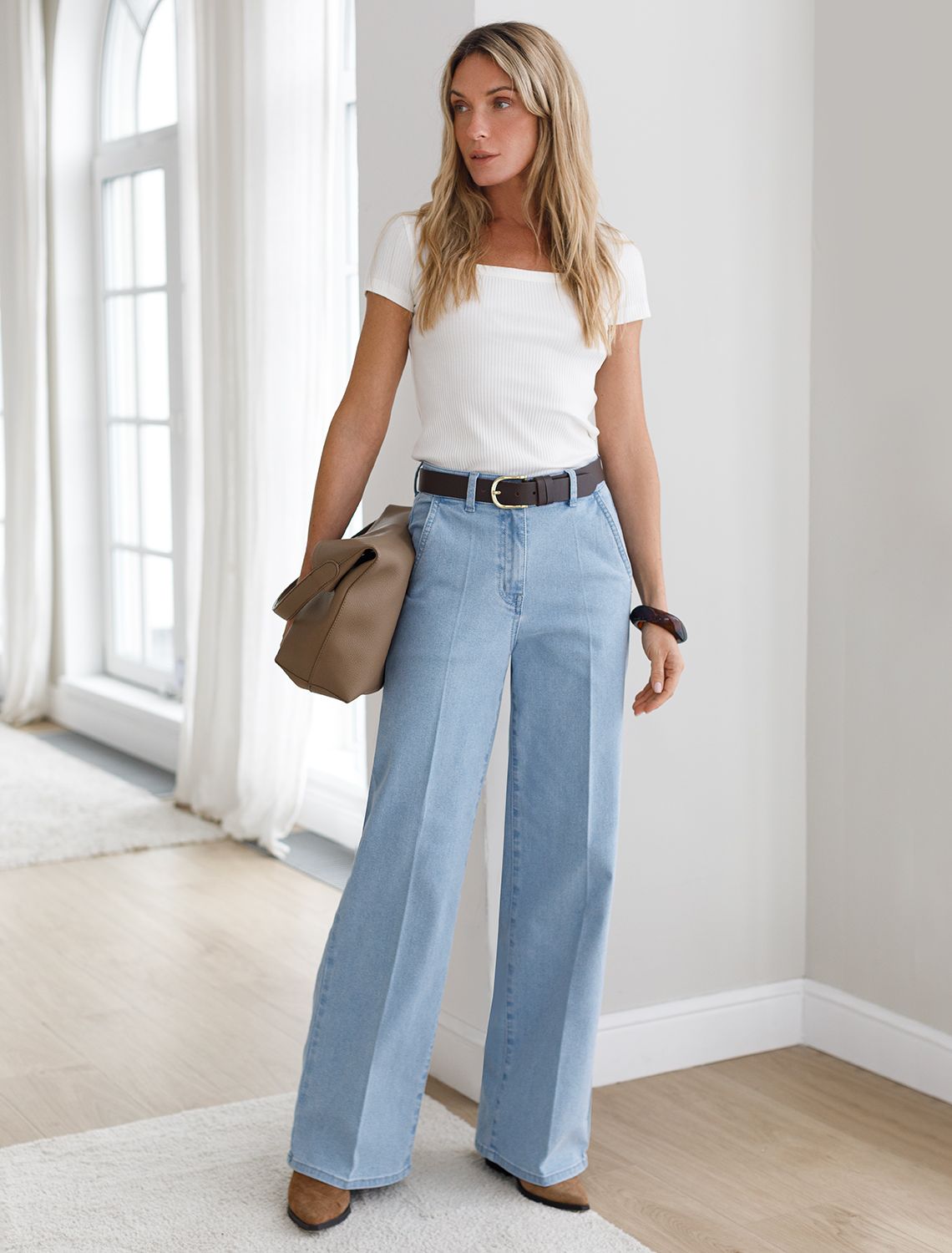 Джинсы трубы голубого цвета со стрелками из эластичного денима — отличный выбор для тех, кто ценит стиль и комфорт в повседневной жизни. Благодаря стрелкам джинсы визуально вытягивают ноги, делая образ более изящным и аккуратным. Классический крой подходит на разные типы фигур и размеры, в том числе большие. За счет эластана модель отлично садится по фигуре, подчеркивая ее достоинства и создавая стройный силуэт, материал способствуют идеальной посадке по талии и бедрам, которая сохраняется даже после длительного ношения. Вы сможете выбрать джинсы,подходящие под свой рост: низкий или высокий. Джинсы подходят для разных случаев благодаря универсальному крою и лаконичному дизайну. Они легко комбинируются с разной верхней одеждой, позволяя создавать как повседневные, так и более официальные образы. Выбирая эти джинсы, вы получаете не просто одежду, а уверенность в своем стиле каждый день. голубой