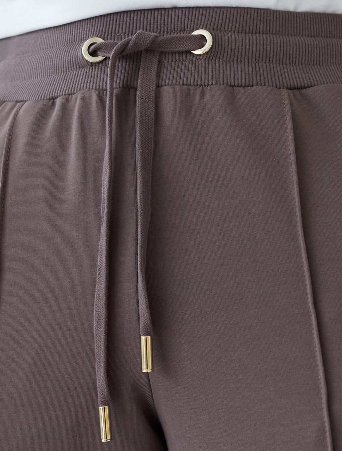 Брюки актуального кофейного цвета прямого кроя выполнены из премиального футера-двухнитки. Лаконичный силуэт поддерживают застроченные стрелки, зрительно вытягивающие силуэт. Удобный пояс на резинке регулируется хлопковым шнурком с золотистой фурнитурой. Наличие эластана в составе изделия гарантирует комфорт и долговечность изделия. Эластичный материал хорошо пропускает воздух, позволяя телу дышать, и легко тянется, не ограничивая движения.