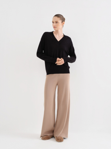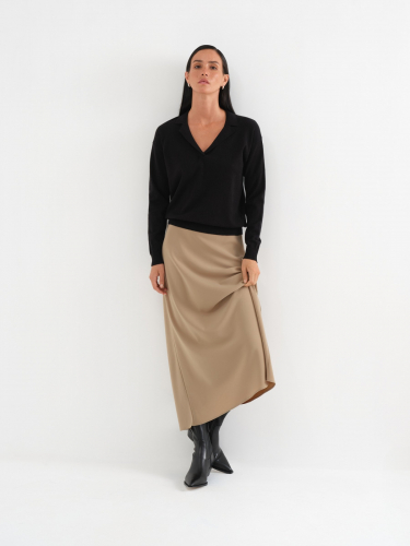 Базовый пуловер с оригинальным воротником поло. Воротник выполнен на запах, что надежно фиксирует его архитектуру. Эта деталь вкупе с полуприлегающим кроем и средней длиной вписывают модель в трендовый концепт old money. Мягкий воздушный трикотаж гладкой вязки с добавкой шерсти мериноса также создает расслабленный респектабельный вайб.