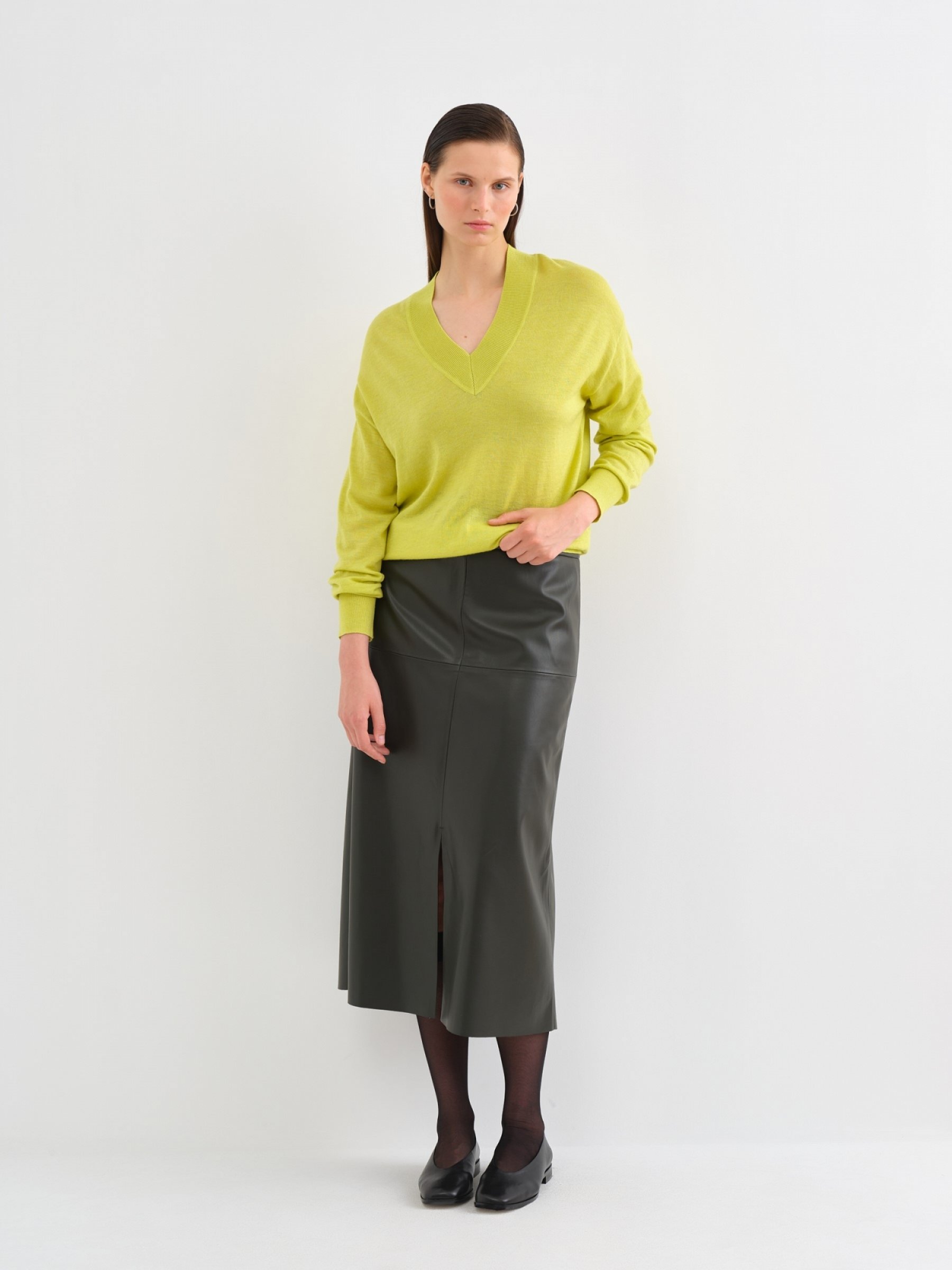 В базовом трикотаже важна каждая деталь. У этого классического пуловера комфортный полуприлегающий силуэт, V-образный вырез средней глубины и оптимальная длина. За счет спущенной линии плеча изделие подстраивается под фигуру. Выполнили модель из мягкого смесового трикотажа гладкой вязки с добавкой шерсти мериноса, поэтому пуловер особо легкий и приятен к коже.