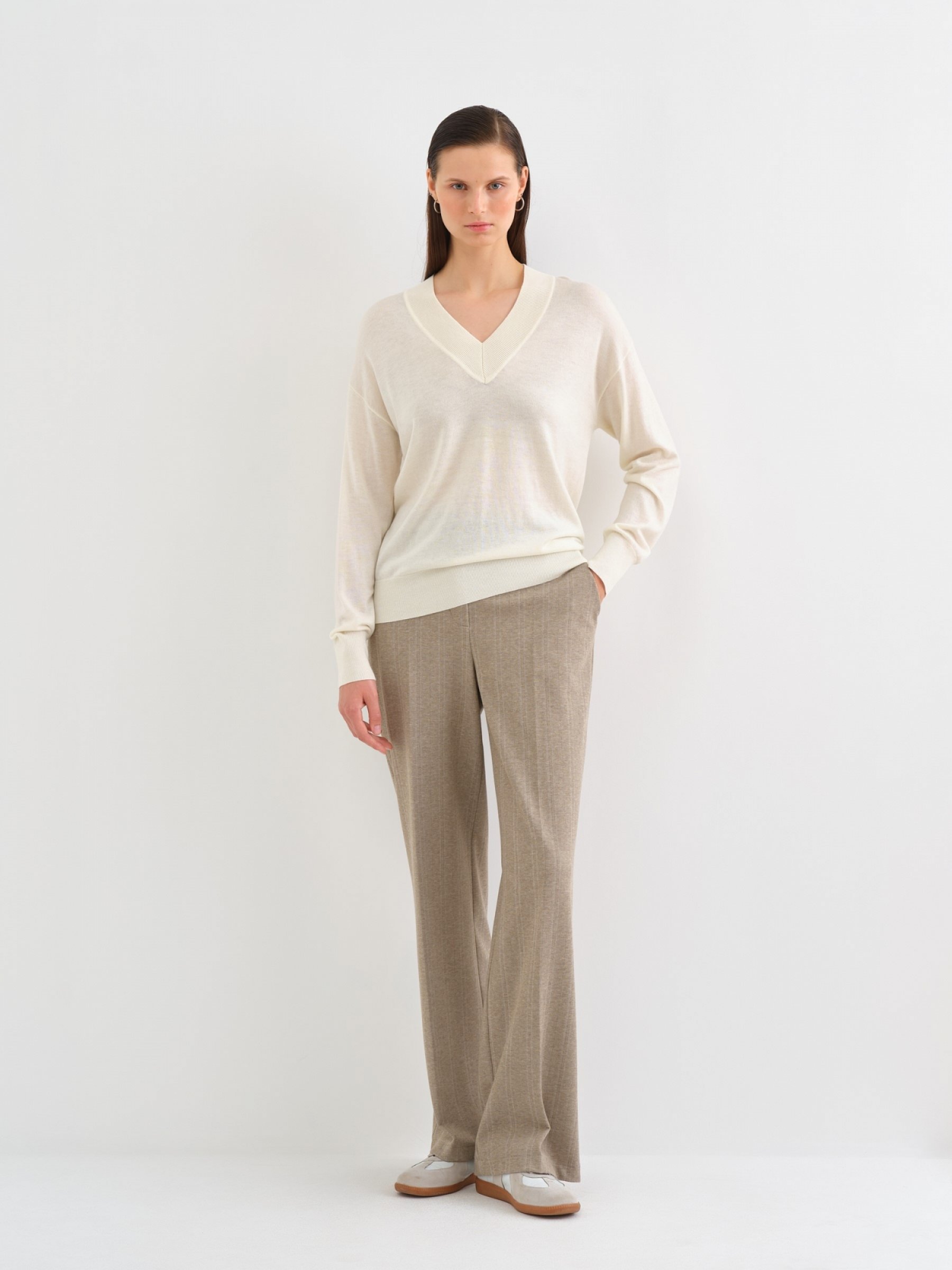 В базовом трикотаже важна каждая деталь. У этого классического пуловера комфортный полуприлегающий силуэт, V-образный вырез средней глубины и оптимальная длина. За счет спущенной линии плеча изделие подстраивается под фигуру. Выполнили модель из мягкого смесового трикотажа гладкой вязки с добавкой шерсти мериноса, поэтому пуловер особо легкий и приятен к коже.