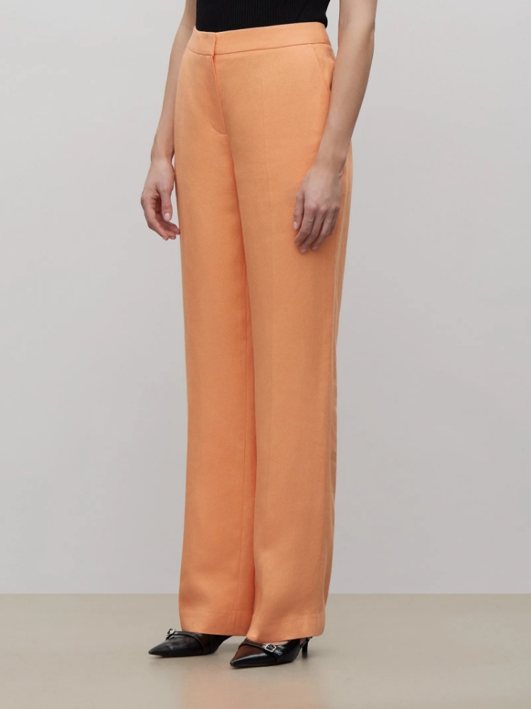 Жизнерадостный оттенок и натуральный материал — рецепт лучшего образа на лето. Брюки изо льна и вискозы выполнены в главном цвете года по Pantone: персиковый пух. Они станут основой "дофаминового" гардероба и просто любимой вещью, которая всегда поднимет настроение. Модель полной длины имеет стильную высокую посадку и широкий крой. Составят прекрасный дуэт с жакетом из комплекта и лёгким шёлковым топом. Изготовлены без подкладки
