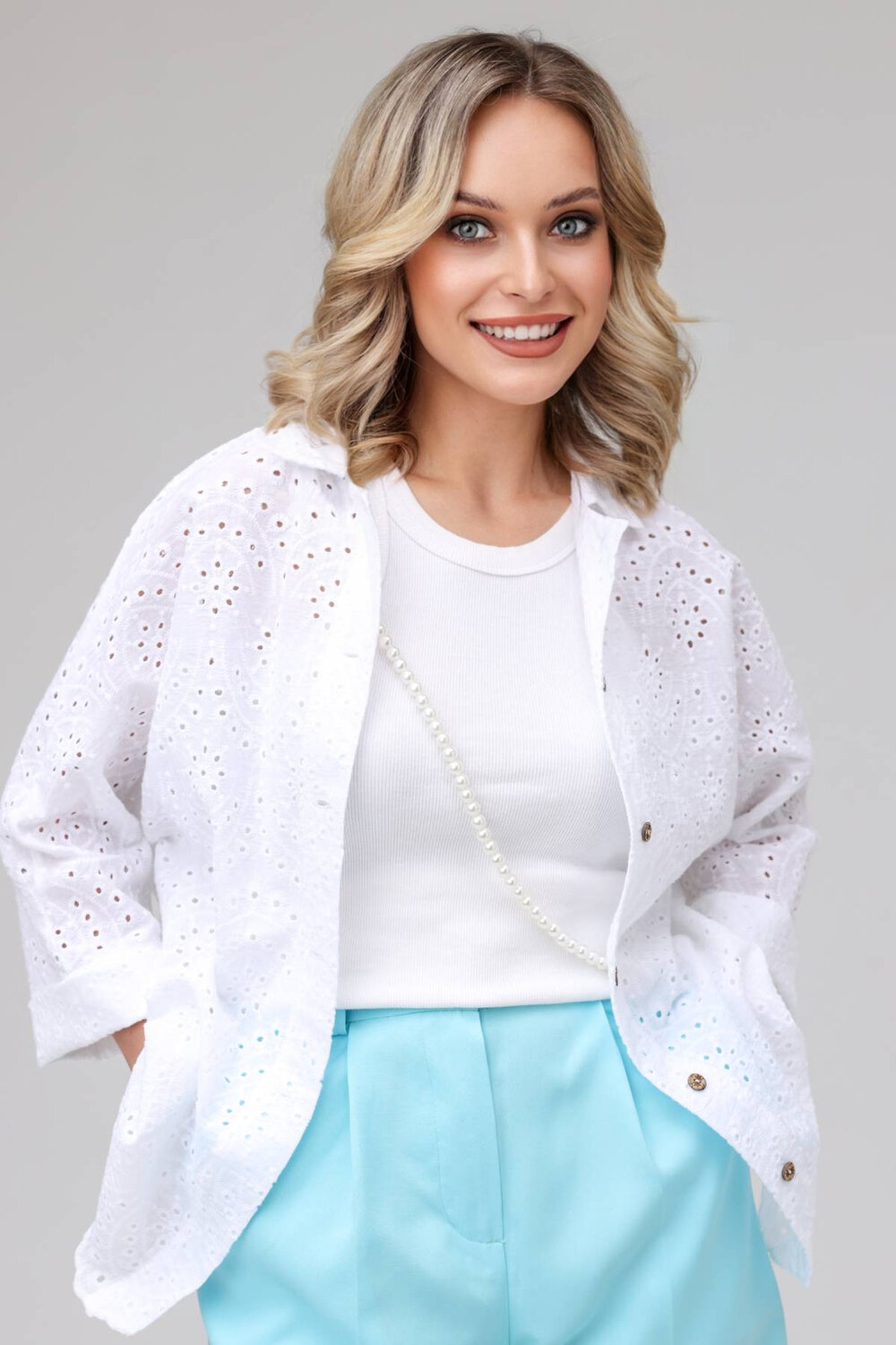 Стильная рубашка свободного силуэта из 100% хлопка-ришелье. Модель "летучая мышь". Отложной воротник. Длина рукава 3/4. Идельно подходит для работы и отдыха.