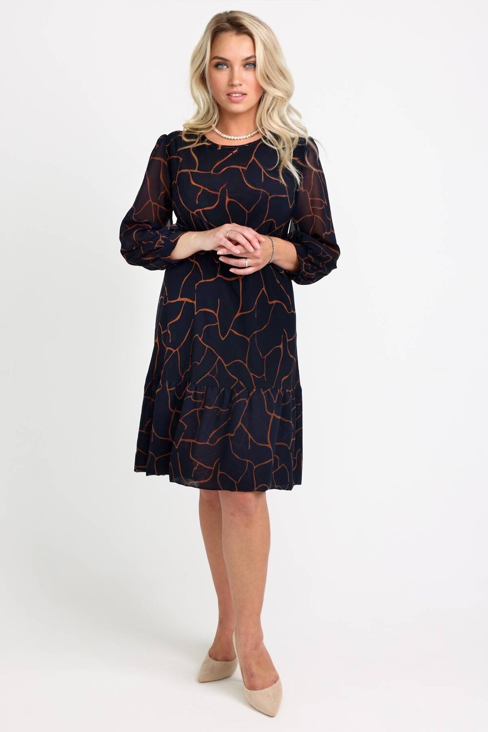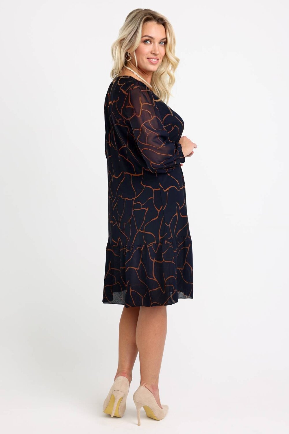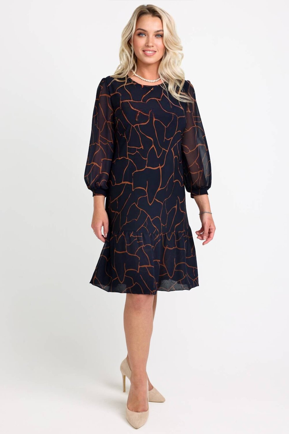 Платье женское классическое, нарядное. Основа платья выполнена из трикотажного полотна - масло, волан и рукав - из шифона. Рукав 3/4. Платье красивое пышное, немного свободное в крое. Базовый вариант платья в А-силуэте.