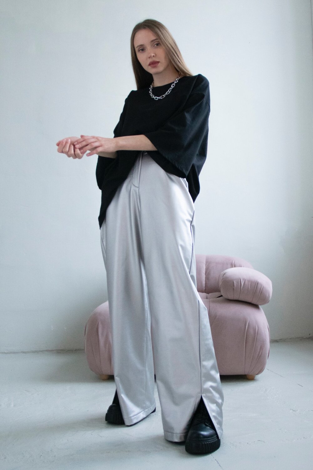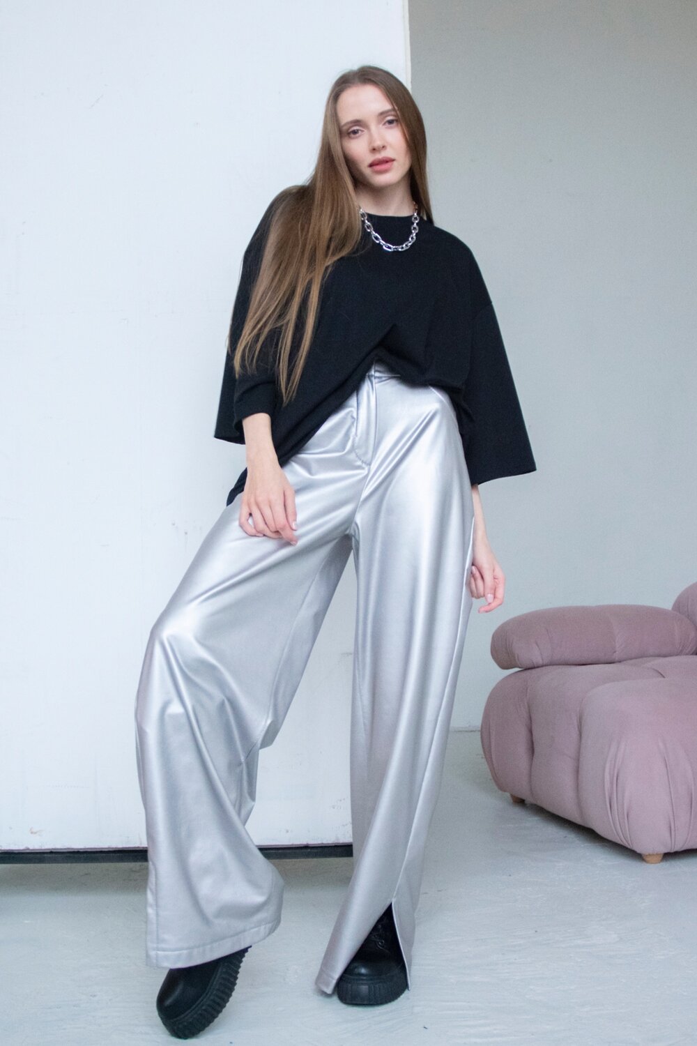 Брюки из эко-кожи широкого силуэта с задними карманами и разрезами внизу.