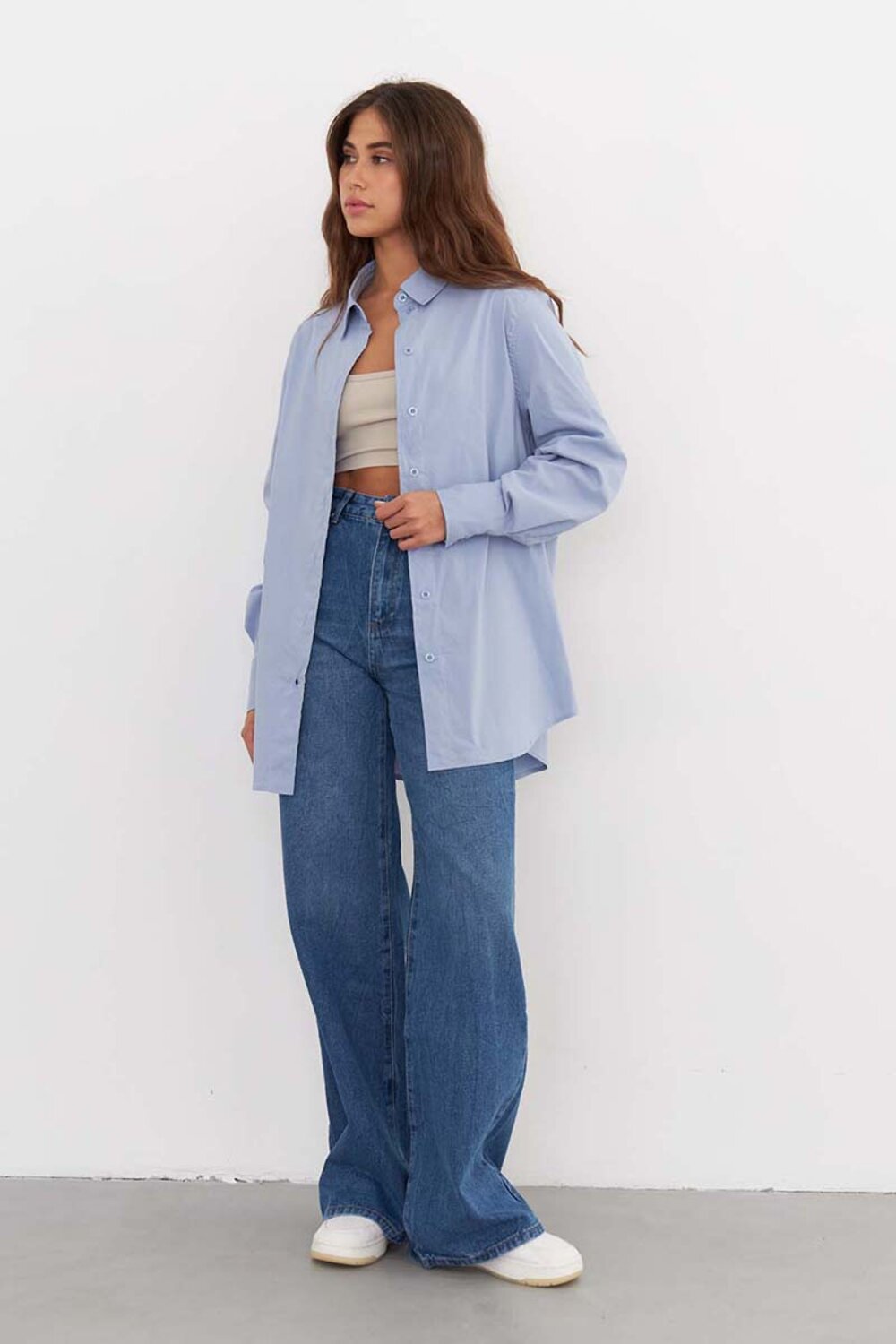 Качественная женская рубашка из хлопка свободного кроя, светло-голубого цвета, с кокеткой на спине, и разрезами по бокам. Рубашка подходит как для офиса, так и для повседневных образов. Рубашку можно носить как блузку, а можно носить как второй слой поверх футболки или топа. Сделано в России на собственном производстве.
