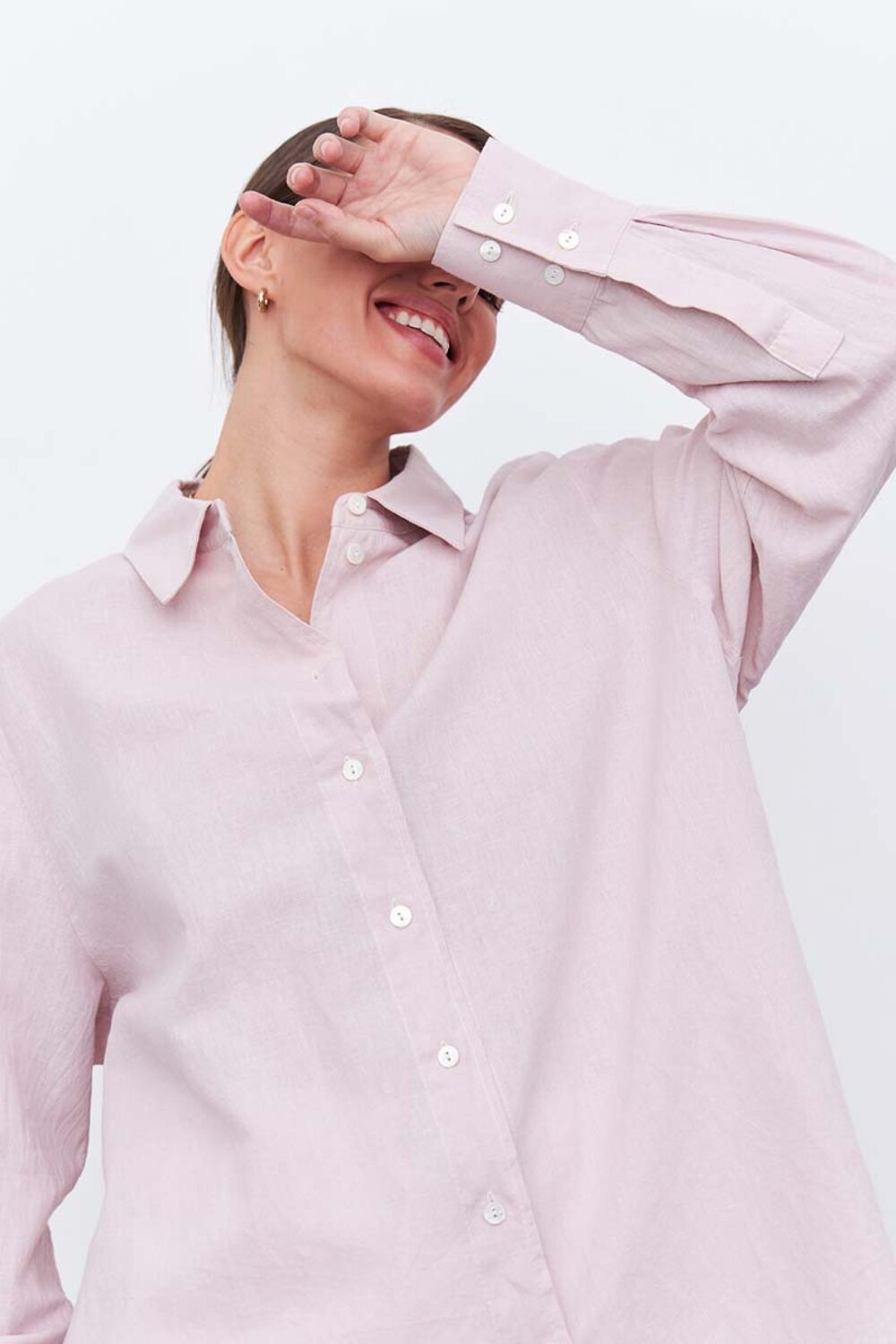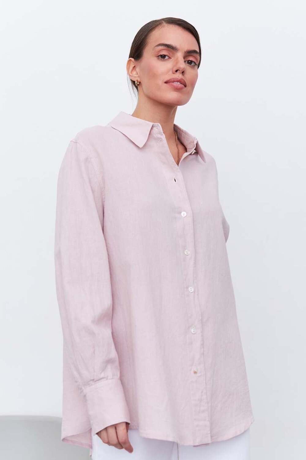 Качественная женская рубашка изо льна свободного кроя, пудрового цвета, с кокеткой на спине, и разрезами по бокам. Рубашка подходит как для офиса, так и для повседневных образов. Тонкий длинноволокнистый лен особенно прочный, отлично пропускает воздух и впитывает влагу, что делает его идеальным выбором для гардероба. Свободная и удлиненная, эта легкая рубашка может дополнить образы для отдыха с шортами и короткими топами, легинсами, джинсами, брюками и юбками. Рубашку можно носить как блузку, а можно носить как второй слой поверх футболки или топа. Сделано в России на собственном производстве.