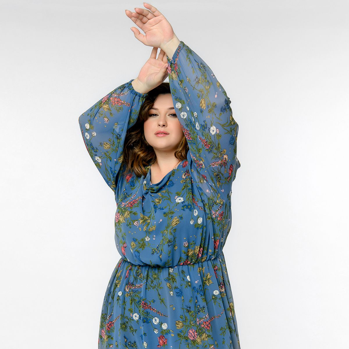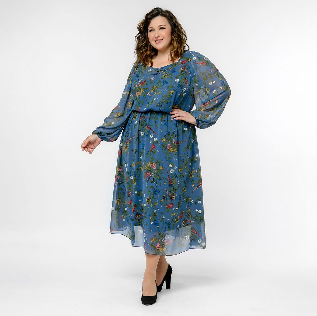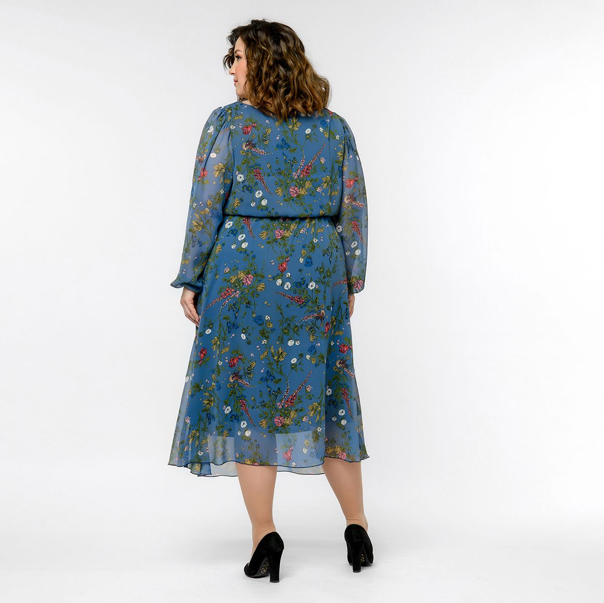 Романтичное платье из шифона с длиной миди.  По горловине переда фигурный вырез. По центру переда легкая сборочка.