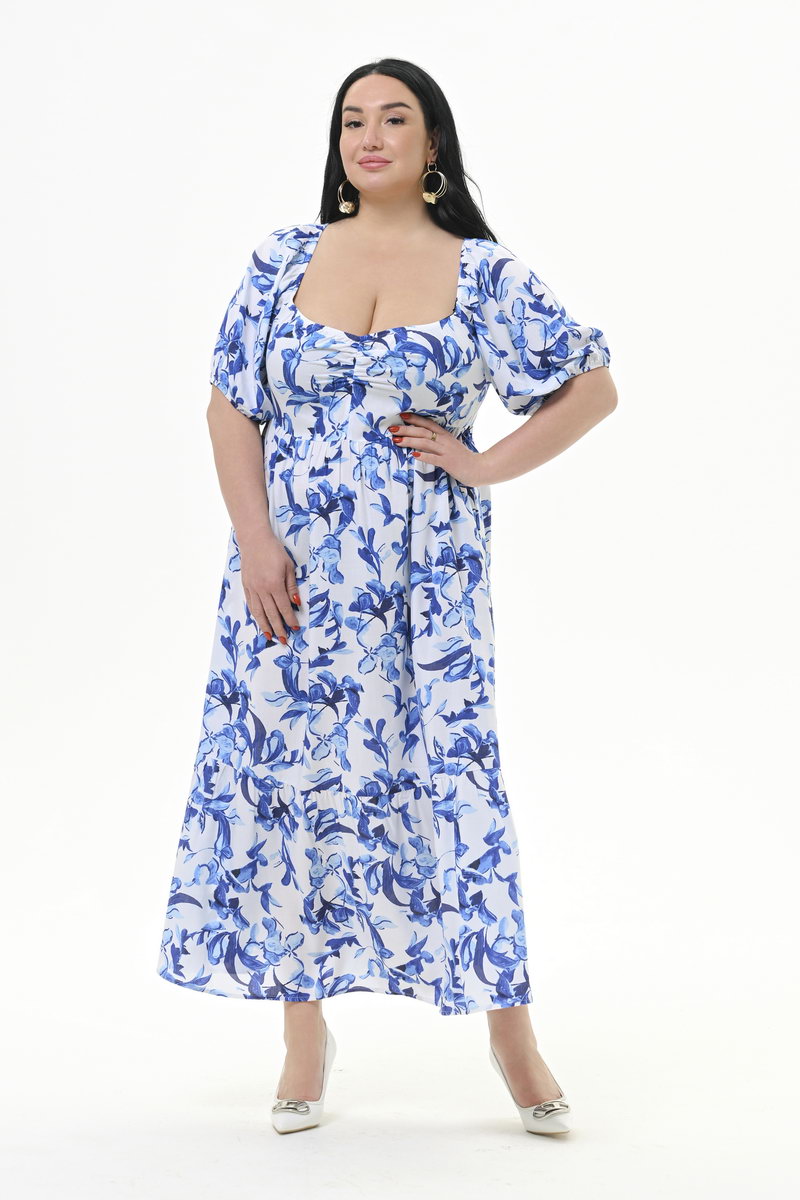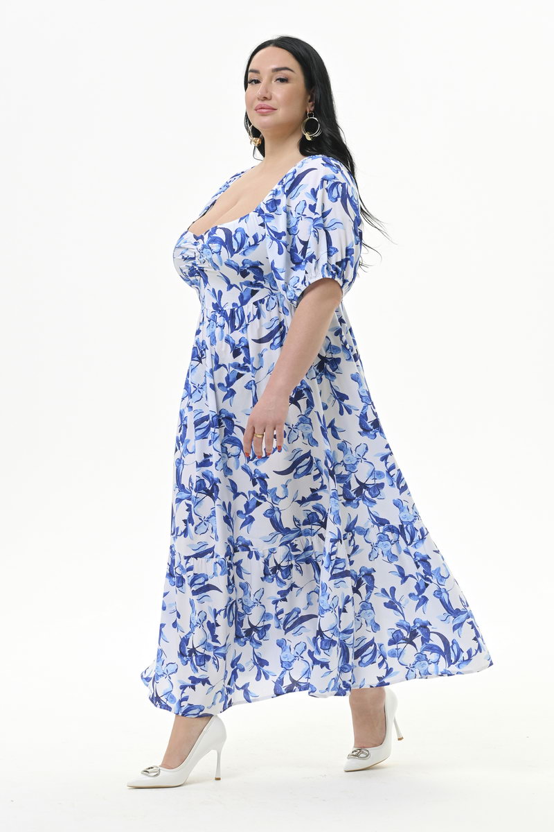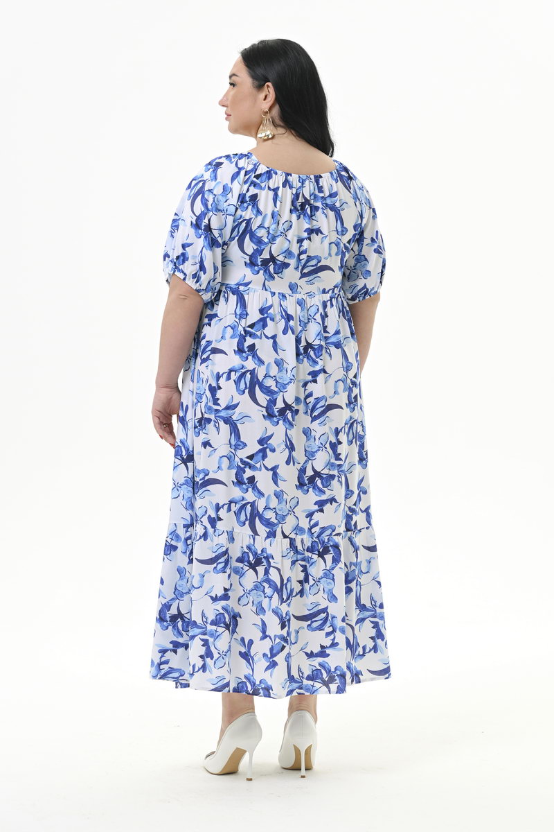 Роскошное летнее платье с открытым фигурным вырезом из вискозы, принт "синяя роспись" *