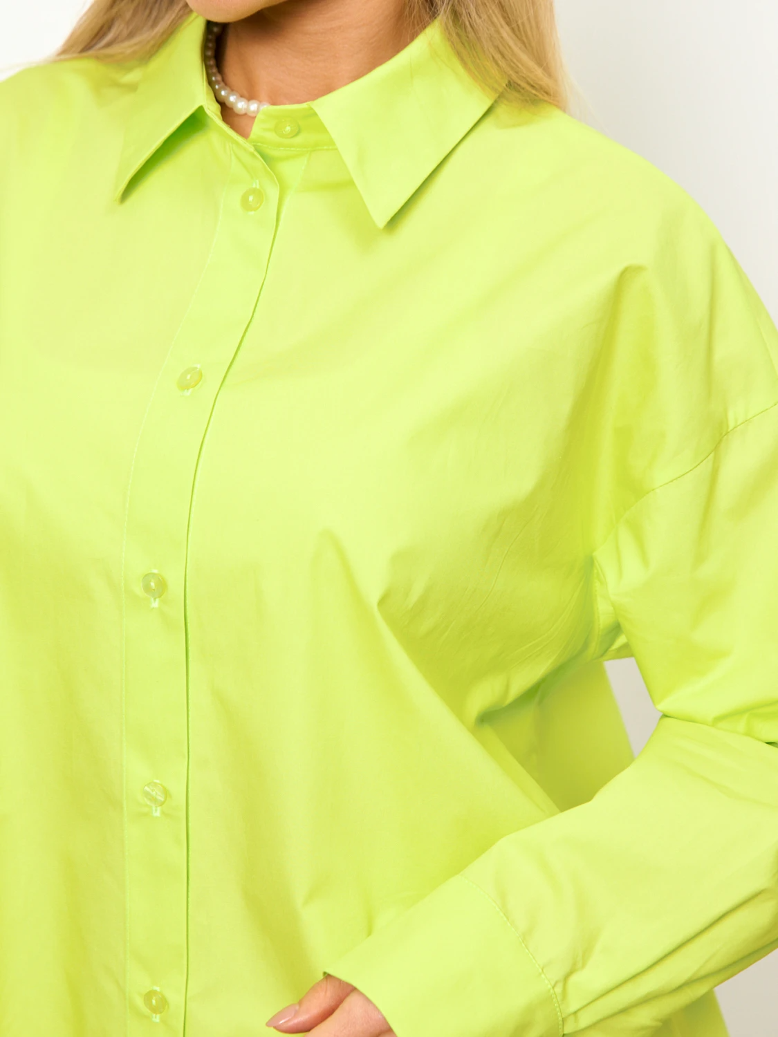 Рубашка свободного кроя со спущенным плечом.