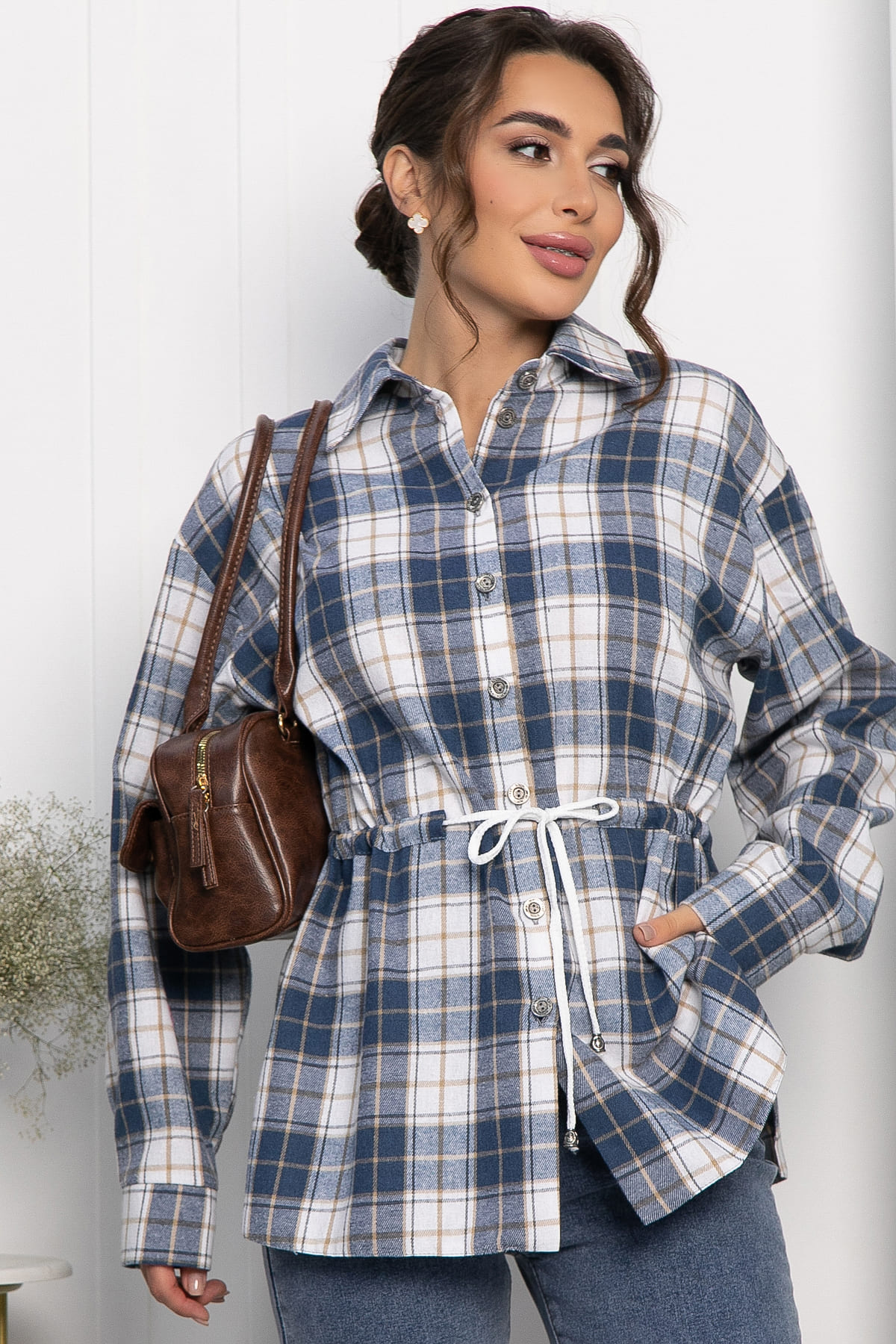 Рубашка в клетку в сине-белом цвете станет стильным акцентом в вашем гардеробе, позволяя экспериментировать с разными образами. Её можно носить как самостоятельный элемент или использовать в многослойных ансамблях. По бокам есть разрезы. Рубашка с воротником-стойкой и аккуратной застежкой на пуговицы выглядит современно и элегантно. Спущенное плечо добавляет расслабленности, а кулиска на талии подчеркивает фигуру. Создайте свой уникальный стиль с нашей новой клетчатой рубашкой!